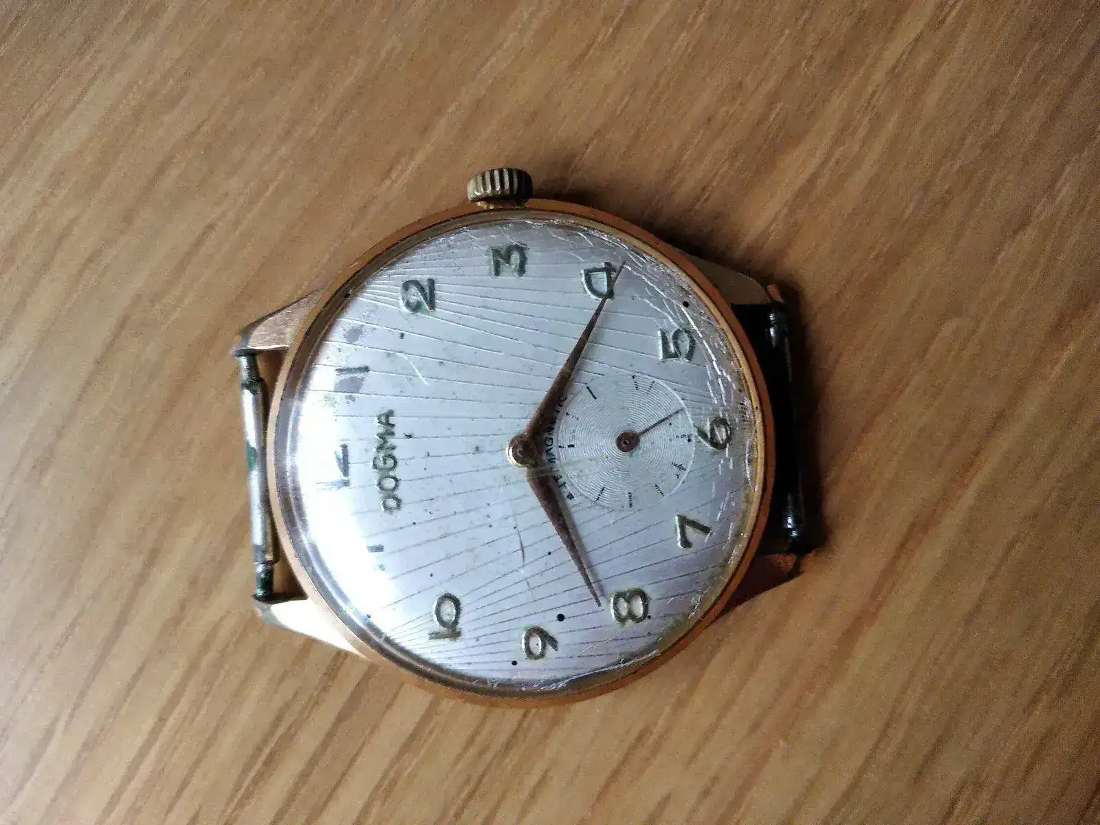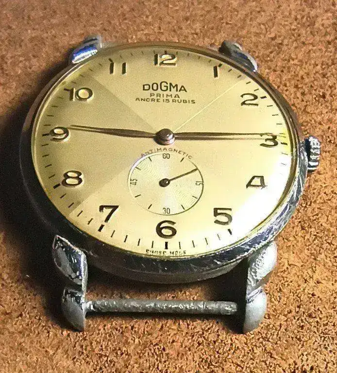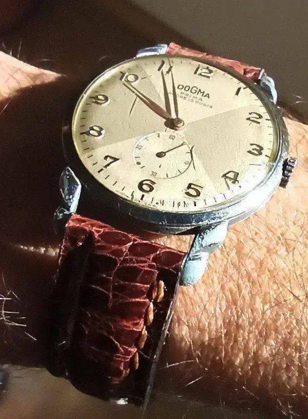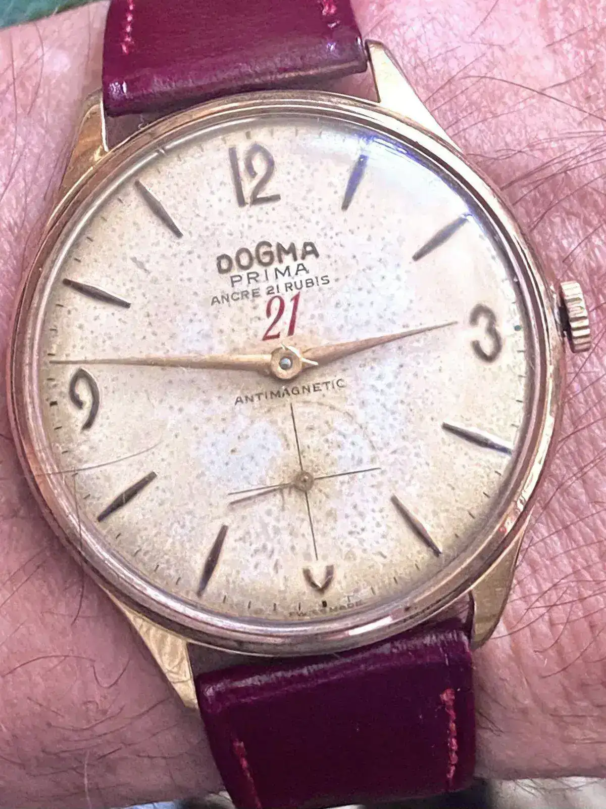 Cacharreando esta mañana me he encontrado con un Dogma que pertenecía a mi madre, yo creo que era de los años 50, no estoy seguro pero lo averiguaré, en fín, el caso es que le dí cuerda y funciona!! Seguramente lleve casi 50 años sin usarse y ahí lo tenéis marchando a la perfección; aún no salgo de mi sorpresa.