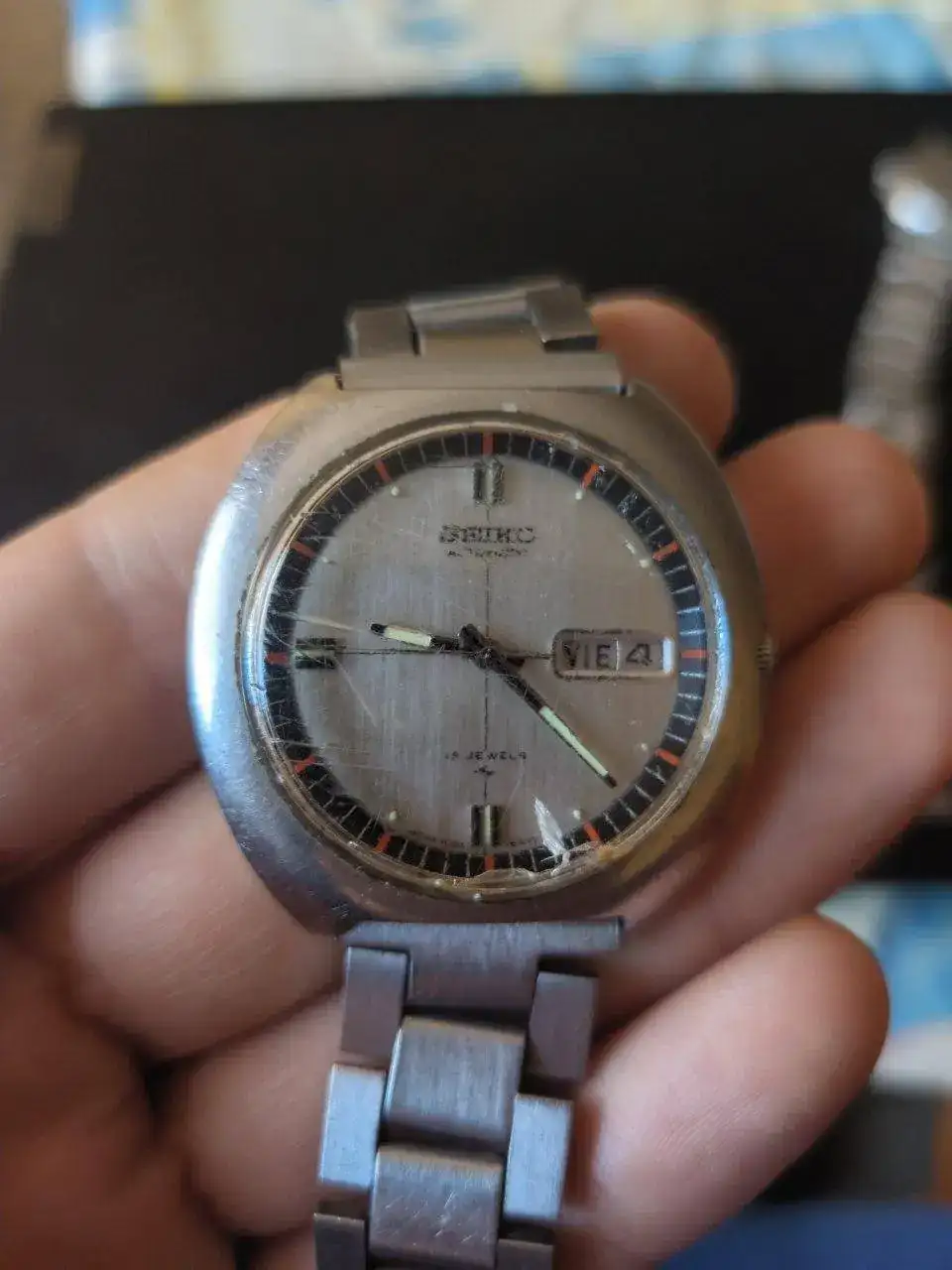 Este primero es un Seiko 7006-6010 automatico Space Orbit de 1972, pero como veis tiene el cristal roto, y al encenderlo la cuerda a penas dura unos minutos. A parte el dia de la semana del fechador veo que no puedo cambiarlo.