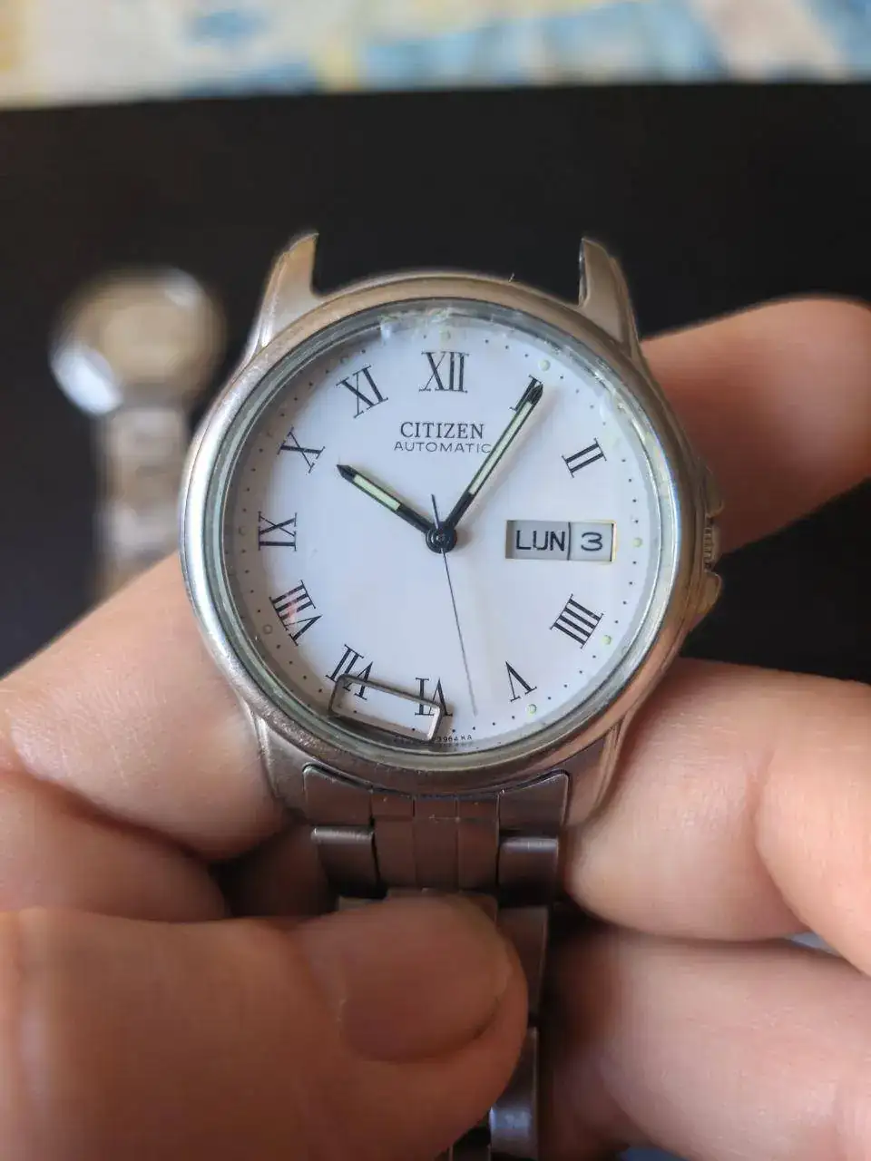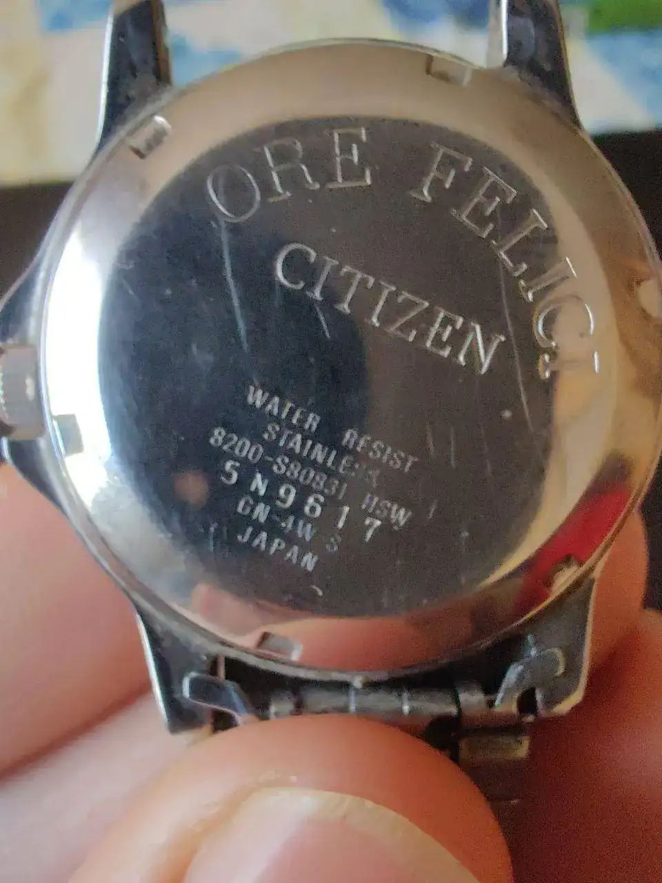 Este segundo es un Citizen 8200-S80831 Ore Felici automático también, calculo que será de la época del otro, 1975 quizá? Está en mejor estado, pero también tiene una marca en el cristal y el rectangulo del fechador está caído. Pero lo encendí ayer y este aún sigue en marcha.