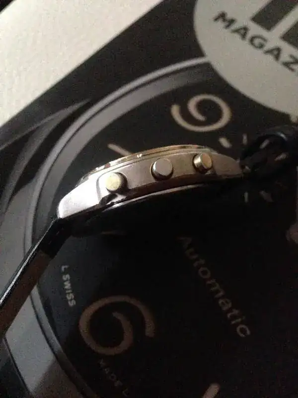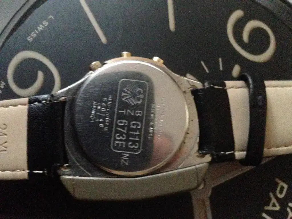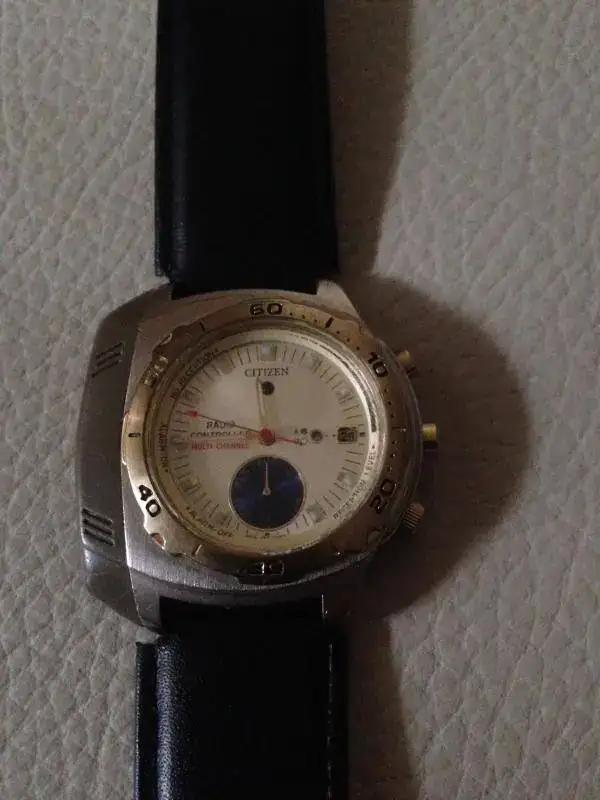 Hola compañeros, antes de Navidades compre en Alemania este curioso reloj del que no tengo mucha información pero que me pareció curioso al ser radiocontrolado, tenía ganas de tener uno y lo compre, no era mucha pasta, el caso es que llegó ayer y como veis el pobre en persona no es muy agraciado, perdonar por las fotos pero hoy hace un día muy oscuro en Bilbao y no salen mejor, el caso es que viene con una correa negra de piel que aparte de estarle grande le queda de pena y no sé qué ponerle para que luzca un poco mejor, no sé si se aprecia en la fotos pero tiene el bisel de color dorado así como los botones, por lo que he podido ver en internet parece que es ese tipo de correa el que lleva aunque más estrecha pero me parece que no le va, por otra lado si tenéis algo de información de él me vendría bien porque ando toqueteado los botones para ver qué función tienen pero no lo veo muy claro, el modelo porque sé que os estáis poniendo malos es Citizen 8410-C70147TA, si tenéis info en castellano mejor que mejor porque ni con el traductor me aclaro de nada parece que lo traducen los indios arapajoes, bueno os pongo un par de fotos más y a ver qué me podéis contar, por el águila de la tapa trasera parece ser que se hizo para Alemania pero no sé si es así de verdad.