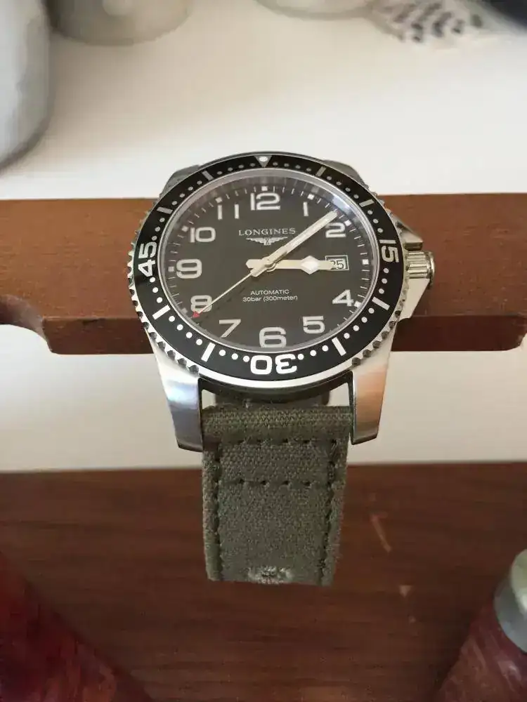 He probado con varias correas, lo que no es fácil por sus 21 mm de ancho de asas, y al final he dado con la que para mi es perfecta: una Barton canvas que me ha llegado hace poco.