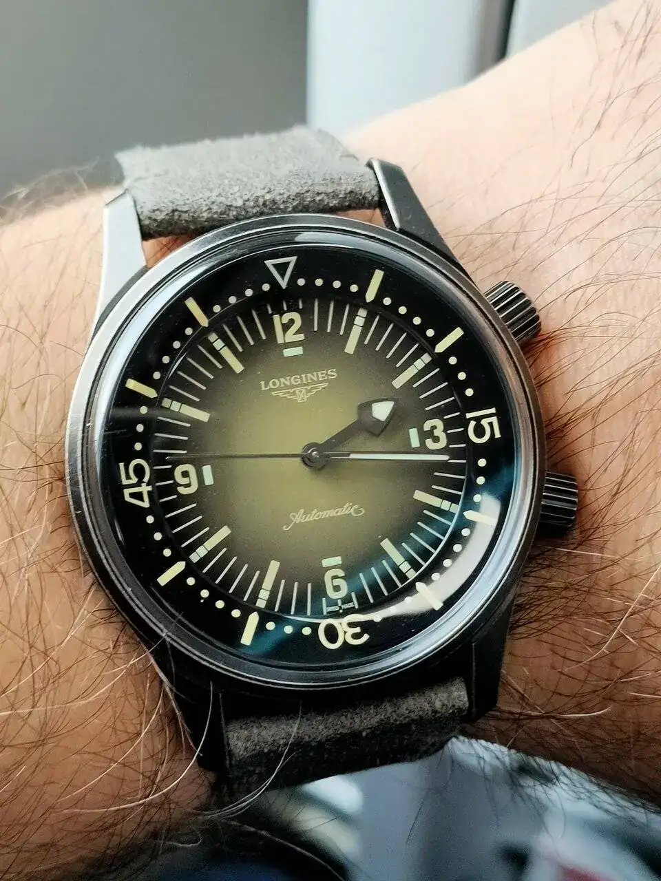 Diseño muy de Longines, rimpedor y original, un dial muy sorprendente que al natural debe ganar, gracias por mostrarlo.Conmigo desde el año 1.984, pero pasa largas temporadas en el cajón