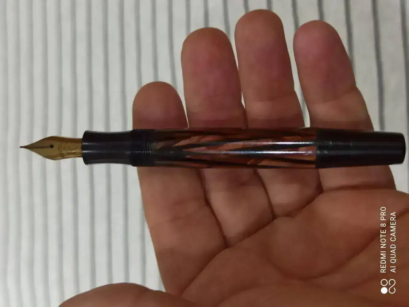 Se trata de una Montblanc 426 Wiese en celuloide de galones de color verde, fabricada en Barcelona. El sistema de carga es por émbolo. Es una pluma muy inusual.