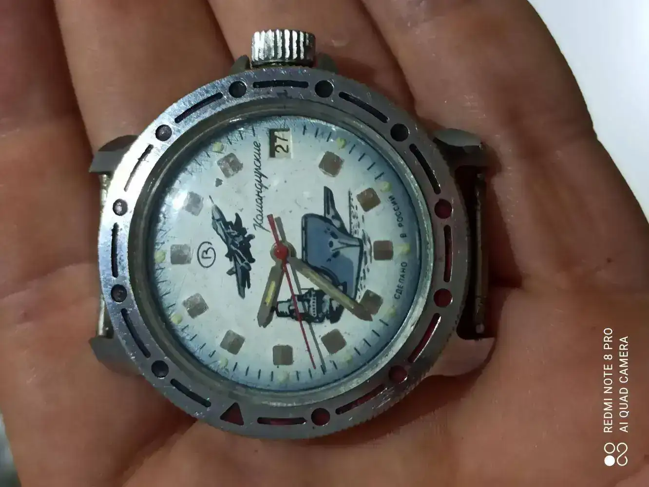 Parece un komandirskie standard, con caja de latón cromado y calibre manual.