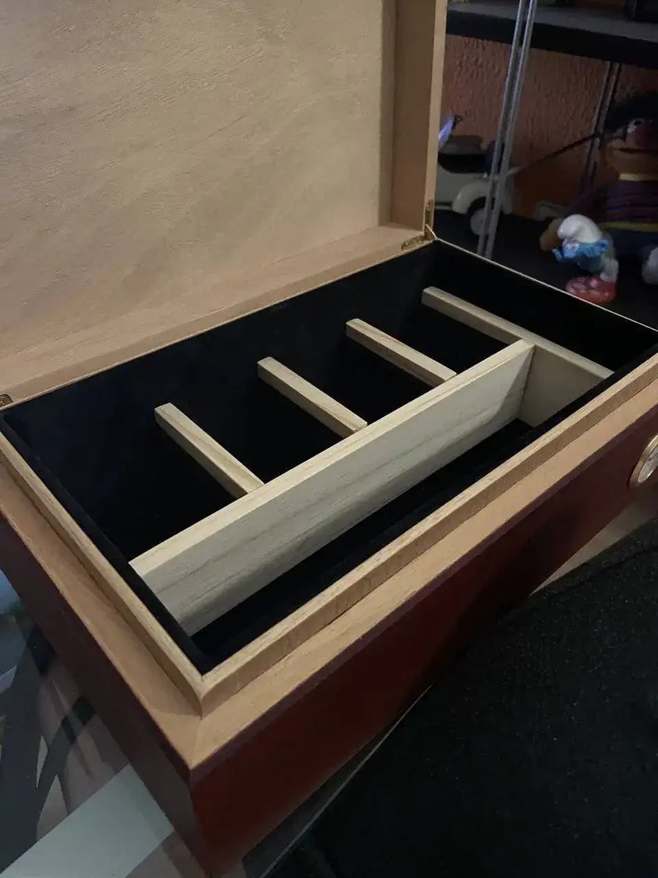 Resulta que llevaba tiempo tras la búsqueda de un espacio donde dejar descansar a mis chiquitines pero con lo peculiar y porque no decirlo tiquismiquis que soy con los pequeños detalles no encontraba nada en el mercado que cubriera mis exigencias y necesidades, todo lo que había en el mercado o no tenia la distribución que yo quería y no tenia la calidad que buscaba y lo poco que existía se disparaba en precio. Ante tal situación me hice una pregunta “ ¿y porque no le echas 🥚🥚 y la haces tú mismo?”.Con la motivación por las nubes empecé a buscar una base con la que trabajar, es decir una caja de madera que pudiera adaptar pero me topé con el mismo problema, lo que yo tenia en mi cabeza no lo encontraba y lo que encontraba tenía precios disparatados eso sumado a la falta de tiempo hizo que la idea se desinflara. De pronto un día cercano a la navidad recordé que mi padre tenía un Humidor de puros en su despacho al cual le tenia mucho cariño ya que era de sus bodas de plata, aprovechando mi visita a casa por Navidad le pregunté a mi madre por él ya que sabía que lo seguía guardando con el mismo cariño que le tenia mi padre, me miro con cara no muy convencida y me pregunto: “¿ Para que lo quieres?”. Le expliqué con todo tipo de detalles la idea y el proyecto que tenía en mente, en ese momento tardo solo unos segundos en cogerlo pasarle un trapo por encima y dármelo.