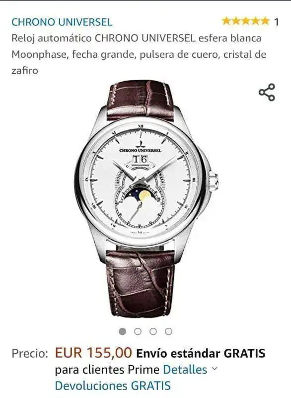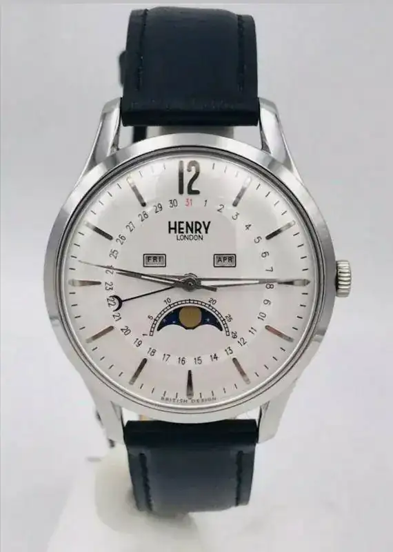 Pues llevo un tiempo trasteando por internet buscando un fase lunar no muy caro y cuarzo (para no tener que poner cada 2 x 3 fecha, fase lunar, hora...muchas cosas). He visto algunos Seiko, Edox, Zeppelin,...algunas chinas,... Pero salvo los Seikos Premier fase lunar no veía nada que me llenara, y se va por encima de los 500€. ... Y hoy me encuentro en Amazon Prime con este Henry London fase lunar y calendario completo que estéticamente me parece muy bonito... Pero 122 € me hace sospechar que la calidad no sea buena (pone movimiento japonés) o que la fase lunar sea un "dia-noche" (aunque esta graduada en 29 días y supongo que sí debe ser fase lunar...).