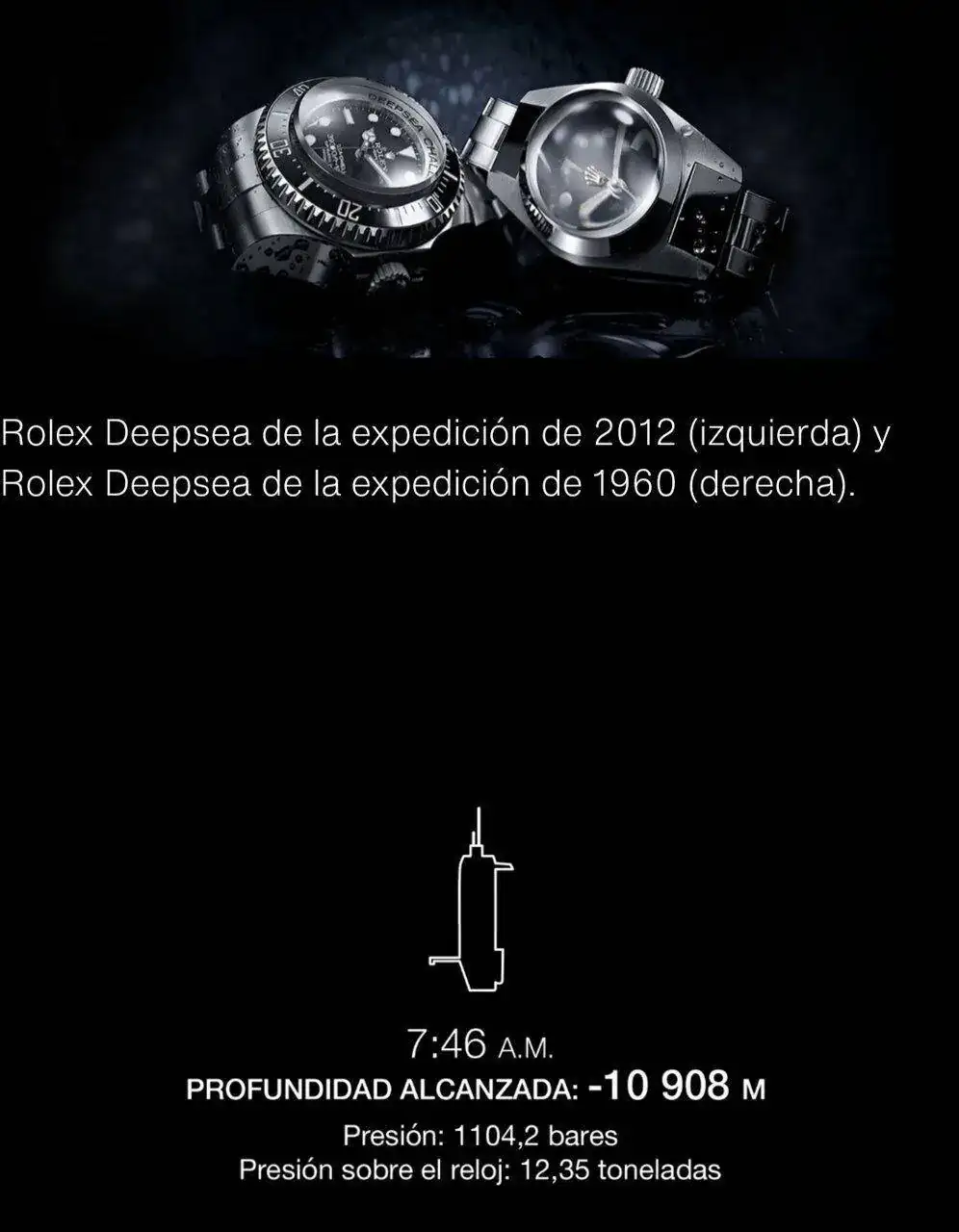 Segun me contaron, llego hasta los casi 11.000 metros pero no toco fondo y si lo hizo Omega a los pocos dias, en fin anecdotas que sumarle a la historia de las marcasPero es real o no que Rolex haya bajado a 11.000 metros de profundidad?