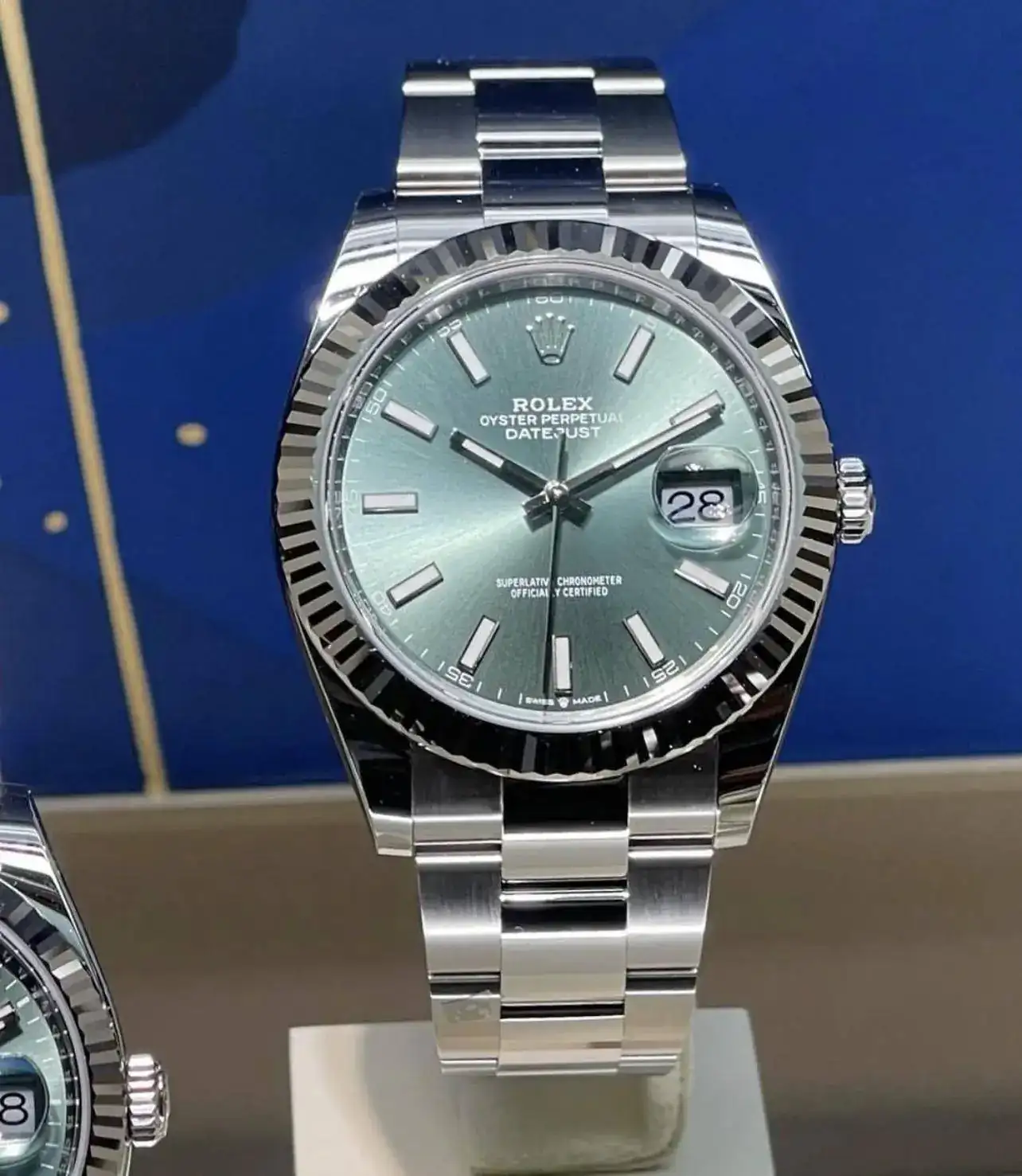 A mi personalmente me gusta mas el tono verde del Oyster, pero este es tambien muy bonito aunque en este modelo me tira mas el azul. Si se vende en España, si poneis en el buscador "todos los relojes" aparece, sin embargo en el configurador a mi tampoco me sale.