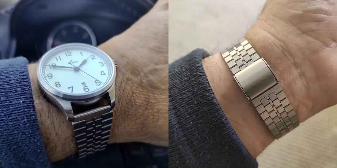 He probado con esta "Seiko-style" y ha mejorado mucho mi sensación. ¡Cosas de la percepción!. ¿Por qué?. Sospecho que porque aunque seguimos con los 18mm, la correa comienza por el lado de las asas midiendo 20mm, lo que aumenta mi sensación de "más ancha" (no se... las manías no las quitan los médicos, dicen).