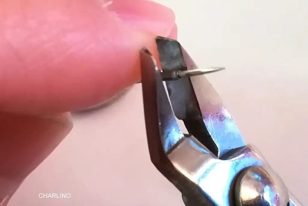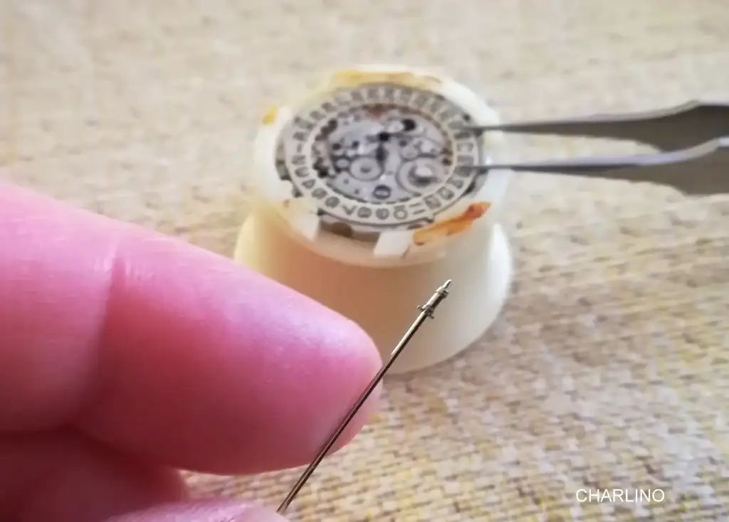 Para quitar el cañón de minutos sí hay que hacer más fuerza. Yo lo hago con unas pinzas. Las pongo totalmente horizontales, pegadas al calibre, sujeto firmemente el cañón con ellas, todo con mucho cuidado y sin dar tirones a los lados, se hace fuerza hacia arriba y sale el cañón. Se puede oir una especie de "clack" incluso. Una vez el cañón fuera, voy a explicar cómo lo cierro yo; hay herramientas específicas, pero somos aficionados y la relojería es una de las profesiones con más cantidad de herramientas que existen. Yo lo hago con las herramientas que tengo, pero con uno de los métodos que he aprendido de relojeros de verdad. Pongo el cañón de minutos en una aguja de coser un poco más fina que él, de manera que el cañón pueda desplazarse por la aguja, y para cerrarlo y quitar así la holgura, utlizo unos pequeños alicates de corte que tengo un poco mellados para esto. Tienen dos pequeñas muescas, una para cañones más pequeños y otra para otros un poco más grandes. No hacen falta las muescas, se puede simplemente apretar el cañón con el filo de los alicates, pero a mí me gusta así, y me sale bien. Todo esto hay que hacerlo con MUCHO tacto, lógicamente, para no cargarse el cañón. Apretar un poco, sintiendo que aprietas pero con la duda de si estás apretando tan poco que no vas a hacer nada. Hablamos de piezas diminutas y frágiles. De hecho, yo todo esto lo hago con la lupa de relojero, porque si no no controlo lo que hago con nada. El cañón puesto en la agujita: