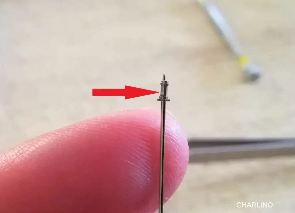 Otra forma de hacerlo es colocando el cañón, con la aguja dentro, en una superficie adecuada donde se pueda golpear con mucho cuidado con un martillito de relojero y un destornillador sobre la muesca del cañón. No tengo fotos de ello porque no lo he hecho así nunca, pero creo que se entiende. Cada uno lo hará mejor de una manera, pero sobre todo siempre con mucho cuidado.