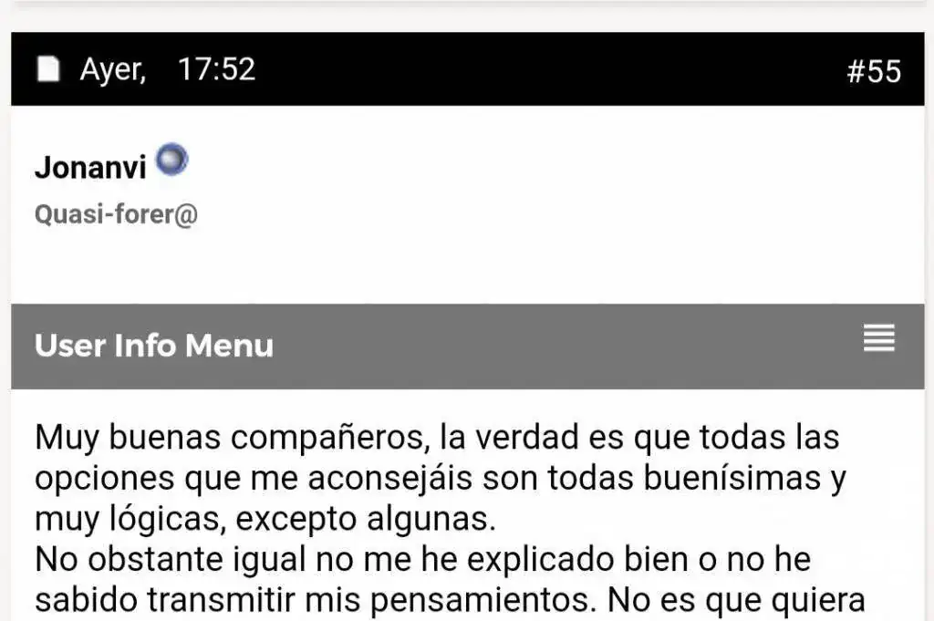 Por lo tanto, por favor no digas que el mensaje viene a confundir a no se quien y que no he aclarado la pregunta en el mensaje inicial, mas bien parece que tu no te has enterado muy bien creo. No obstante la mayoría de los compañeros me han aconsejado estupendamente y casi todas las opiniones me han aportado mucho y estoy muy agradecido, ademas de que me hace disfrutar mucho del hilo viendo las opiniones de los demás que es de lo que se trata.