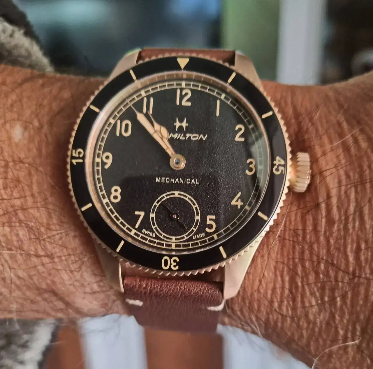 Muy bonito, si .Pues hoy o este flamante y recién estrenado (ayer) Hamilton Aviation Khaky Pionner bronze de 43Ø , que solo oyéndole como se carga manualmente ya es un placer.
