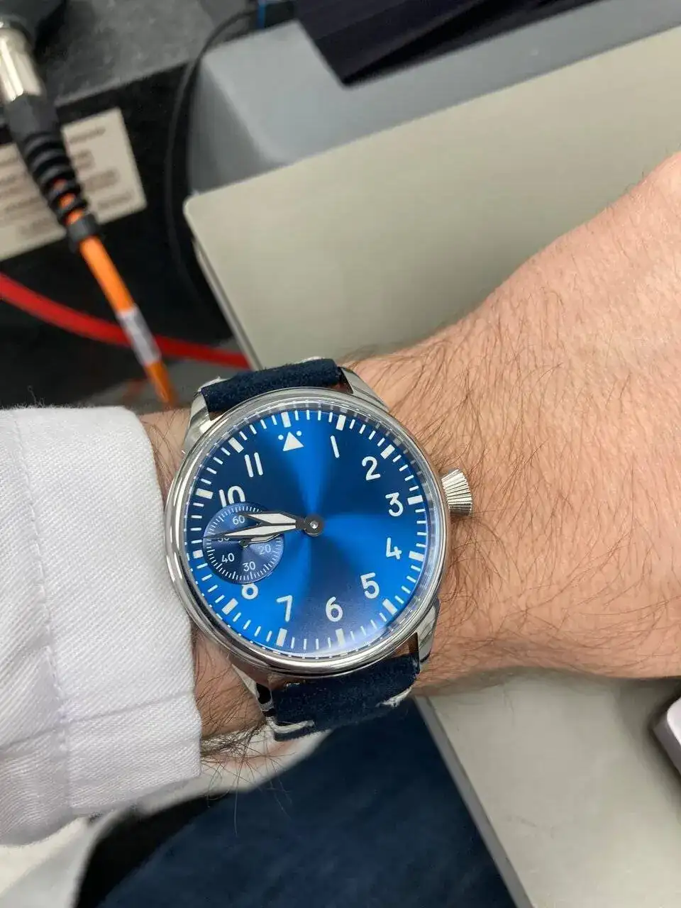Hoy llevo este aviador de cuerda que me monté yo mismo, con un calibre chino y sin embargo una precisión envidiable, ya que al llevar movimiento de reloj de bolsillo, tiene un volante de inercia muy pesado que lo hace muy estable.