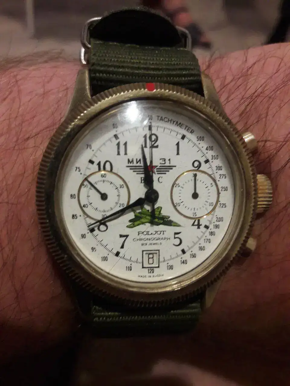 Amigo David, a un habitual en este hilo como usted, se le perdona todo.Y yo tonteando Don José y no pongo el mio. Un Poljot chrono 3133 de transición entre la caida de la Unión Soviética y el nacimiento de la Federación rusa.