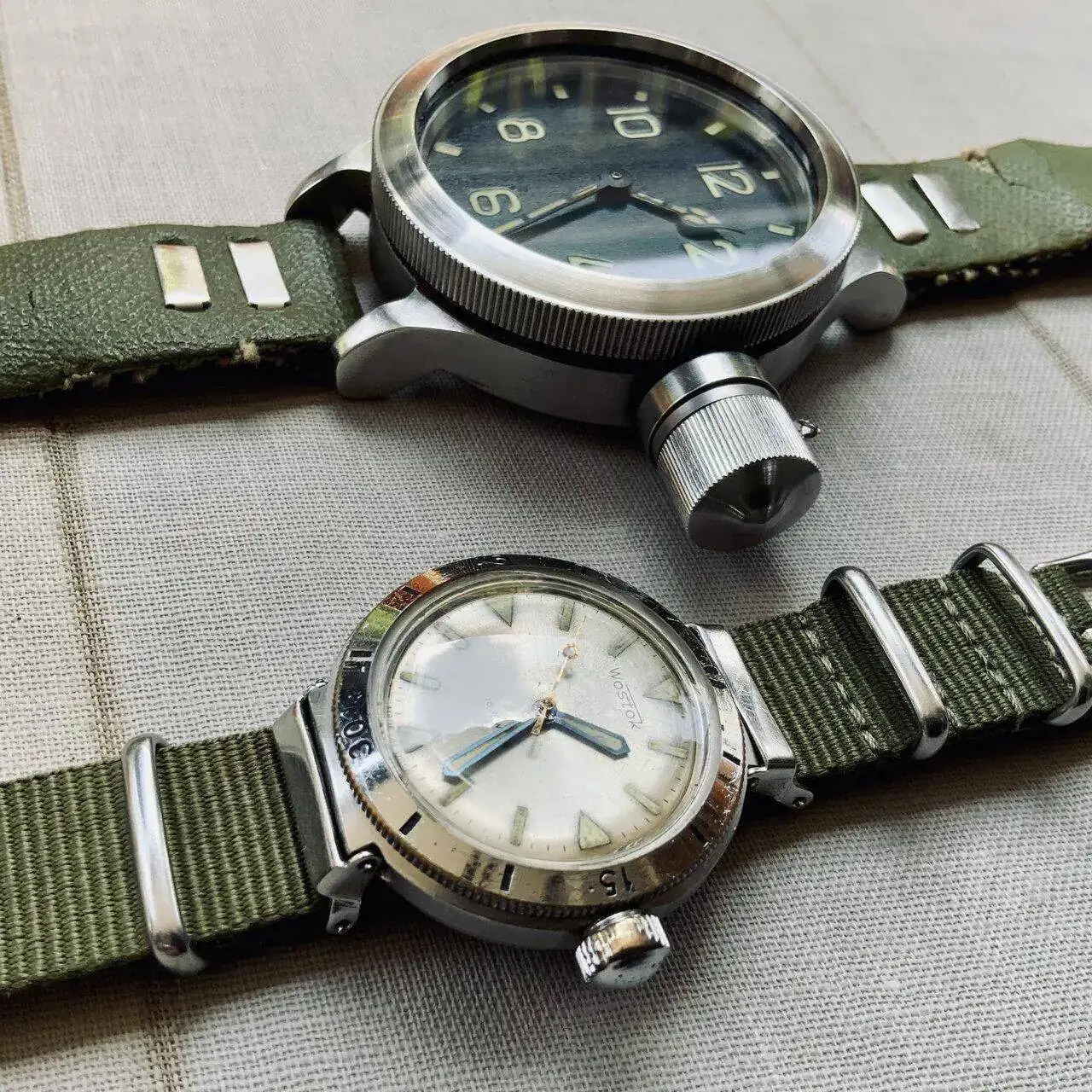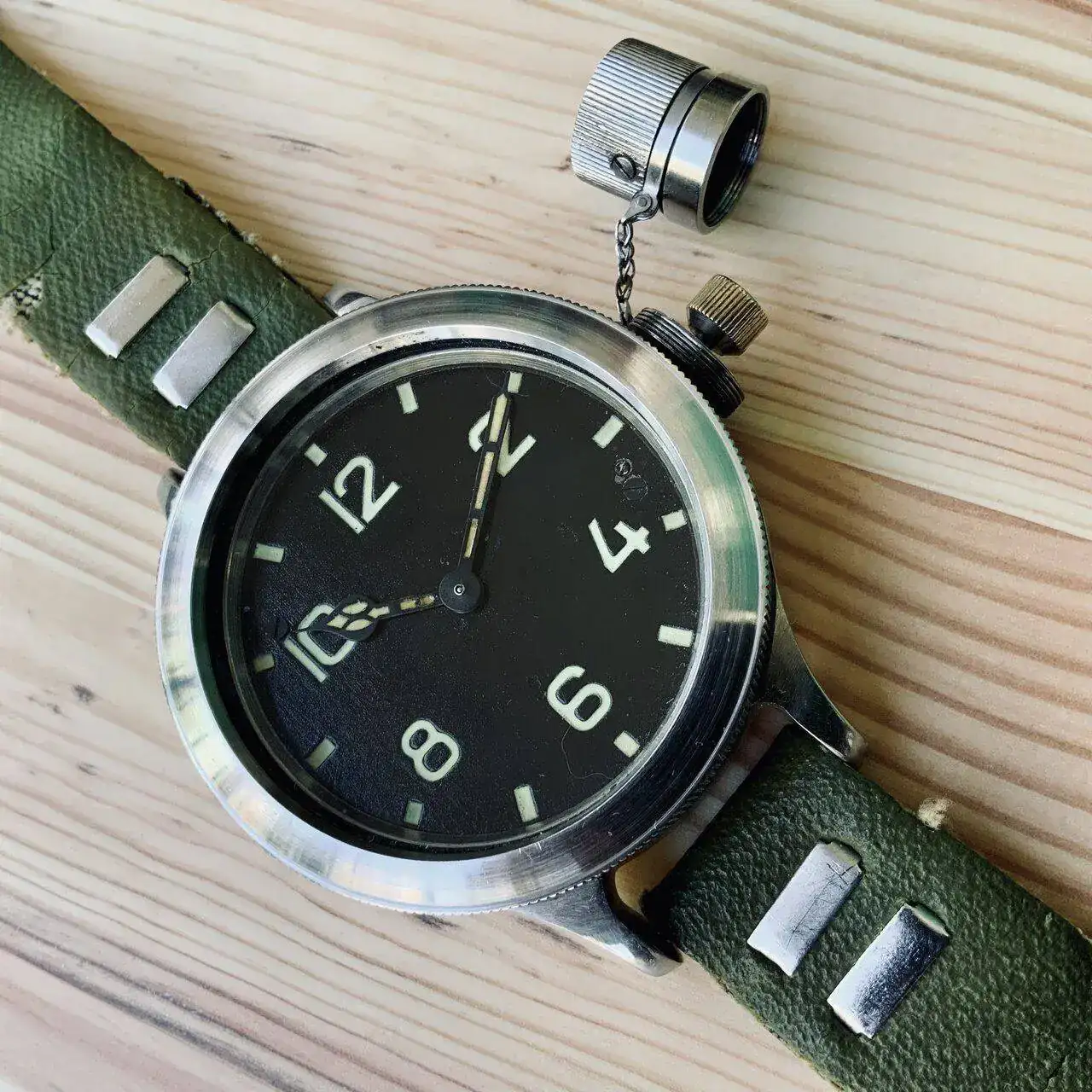 La pieza que ves atada a la corona es el protector de la misma, y es característica de los primeros diver, también conocidos como "canteen". Mediante esa pieza que se rosca se garantiza la hermeticidad de la caja de acero inoxidable monobloque. Es un reloj de dimensiones considerables: 60mm sin corona, 80mm con corona y un par de centímetros de alto.