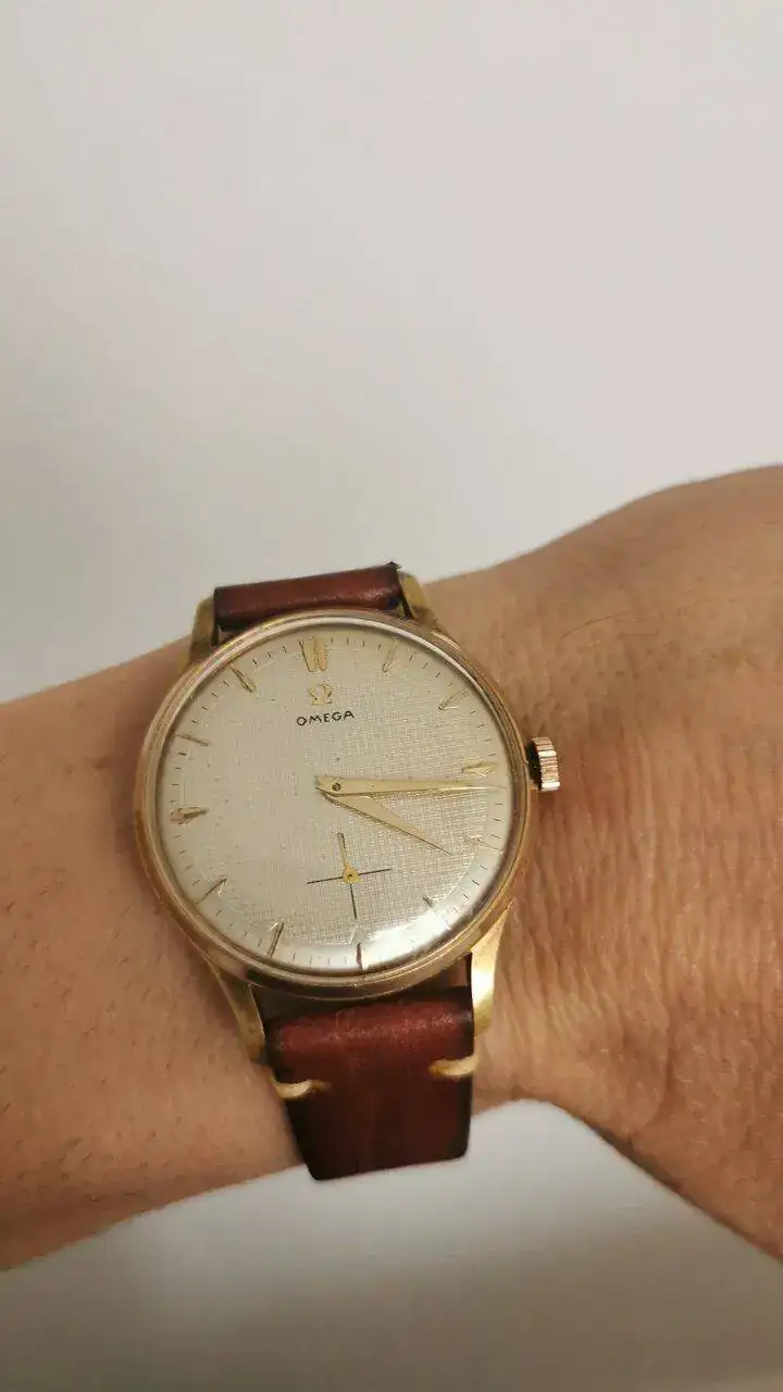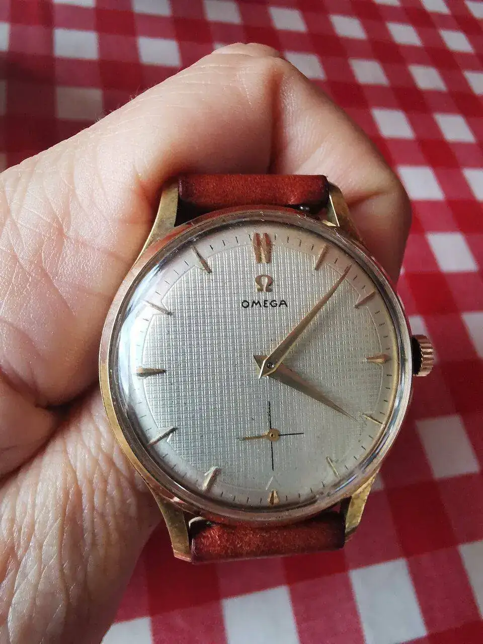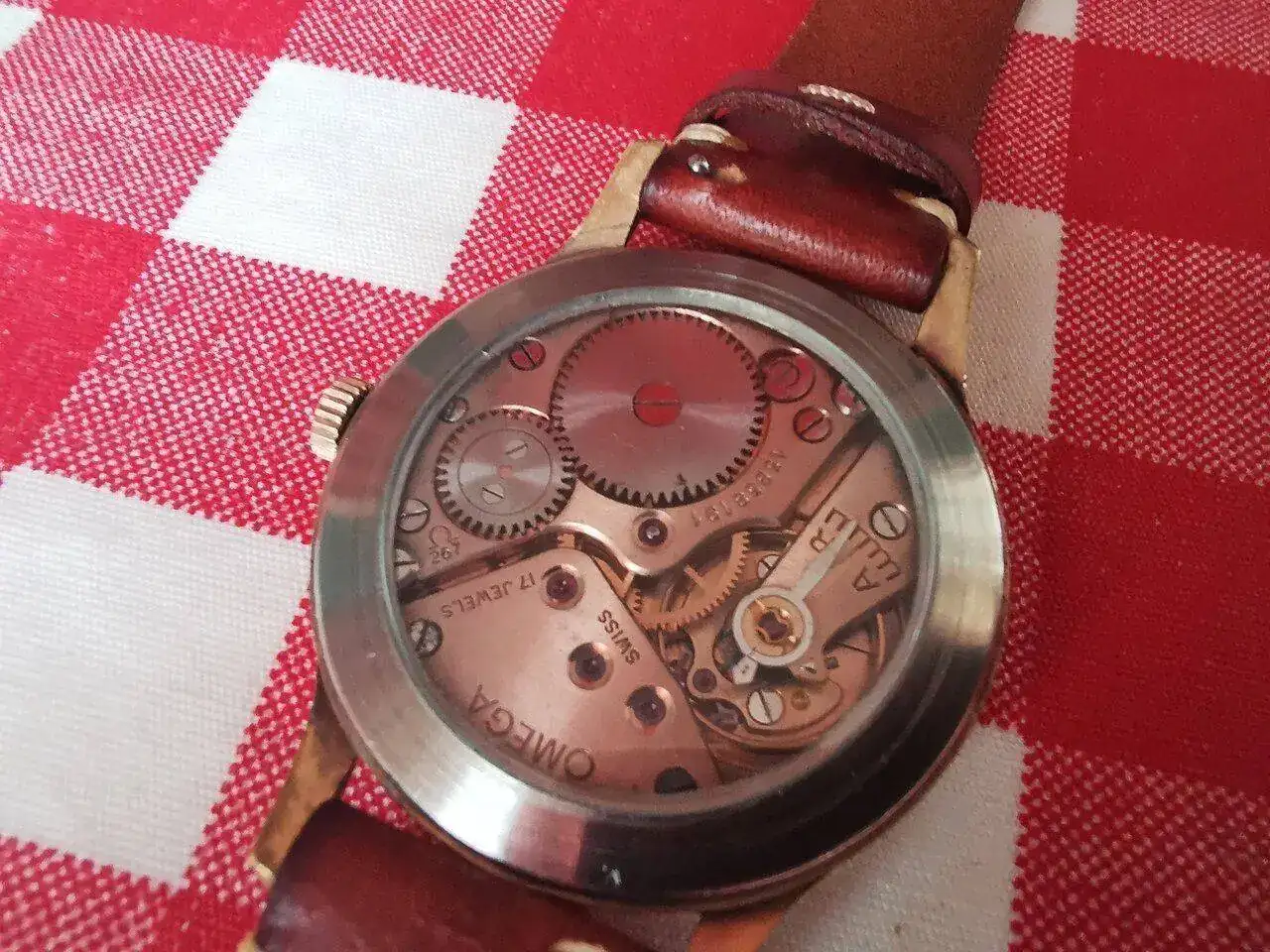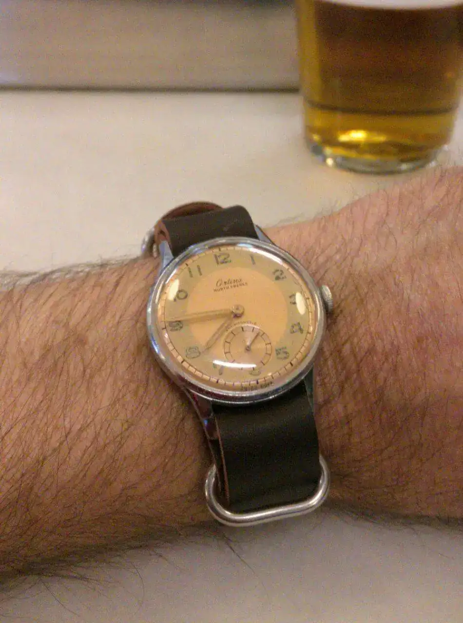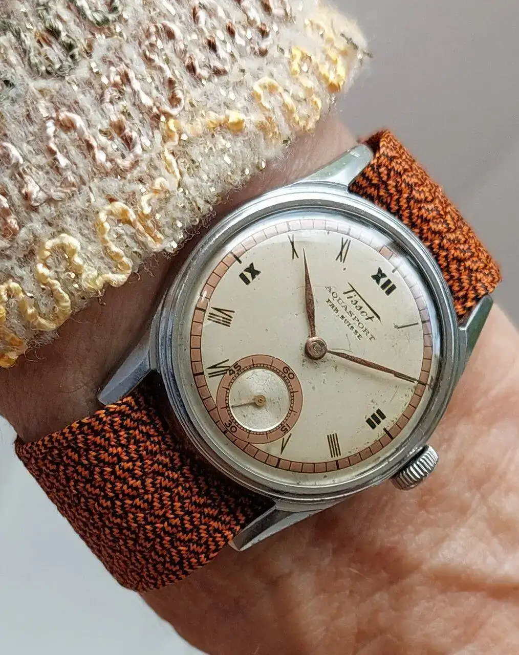 Preciosa piezaUn Certina de los años 40, de asas fijas, con una preciosa esfera «bull's eye» entre champán y salmón, y un KF330 en su interior.