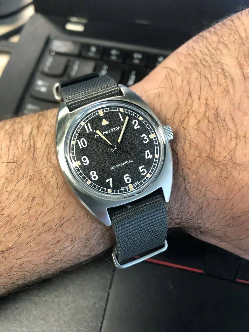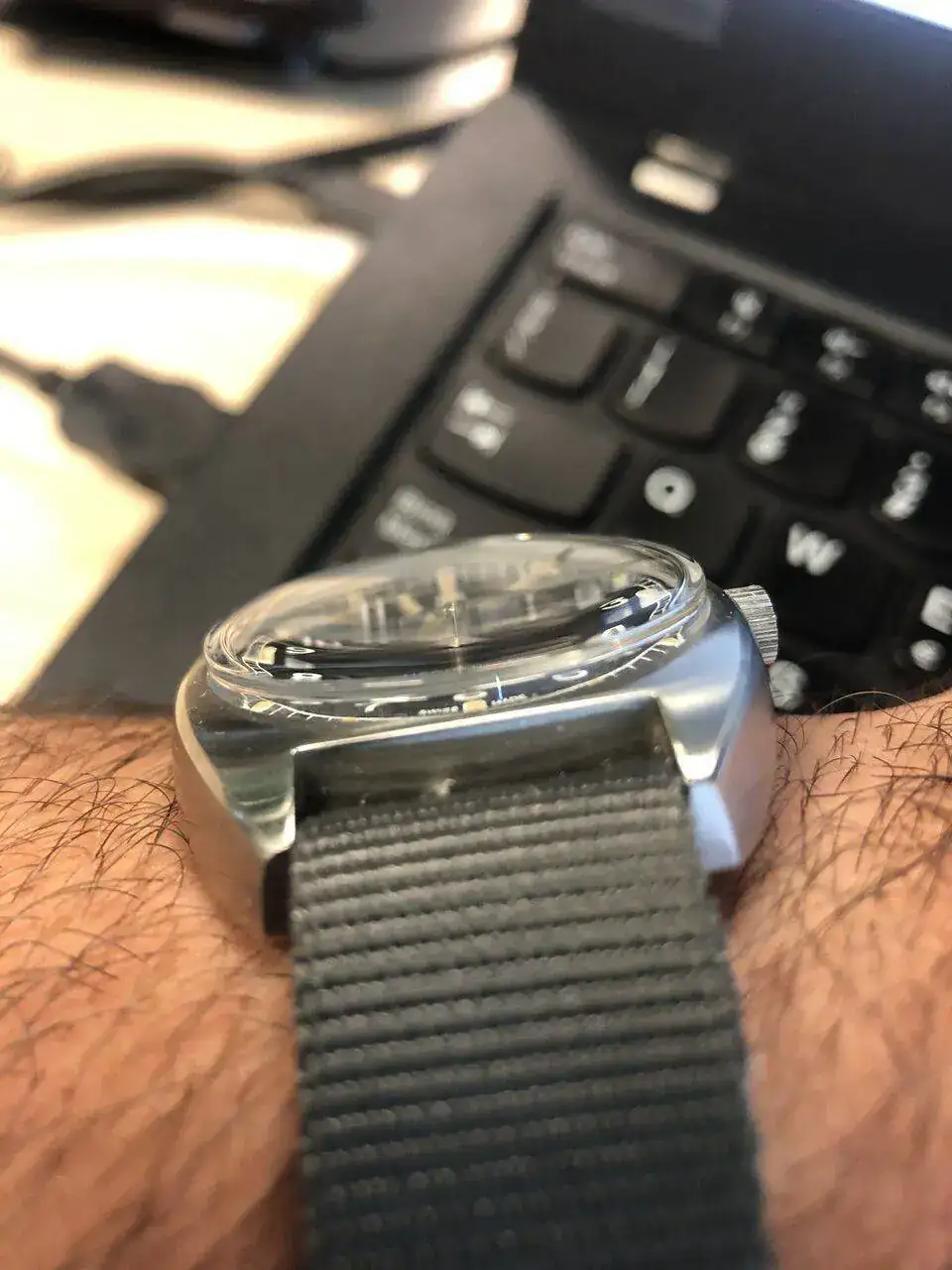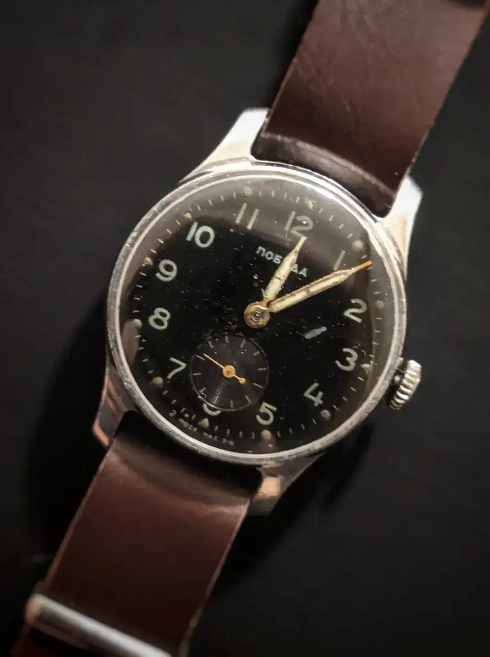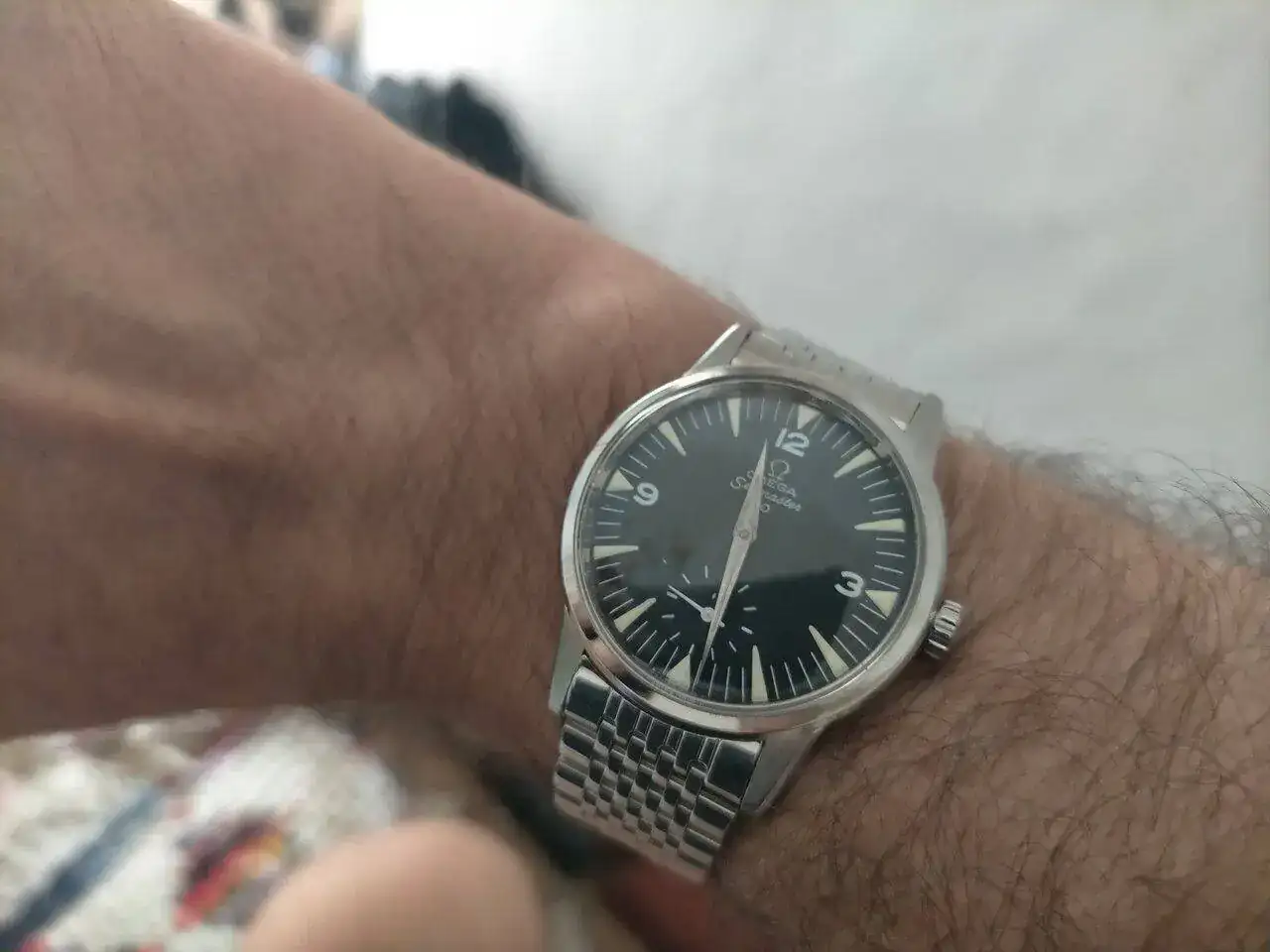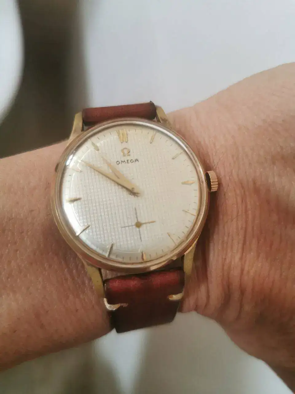 Preciosa piezaUn Certina de los años 40, de asas fijas, con una preciosa esfera «bull's eye» entre champán y salmón, y un KF330 en su interior.