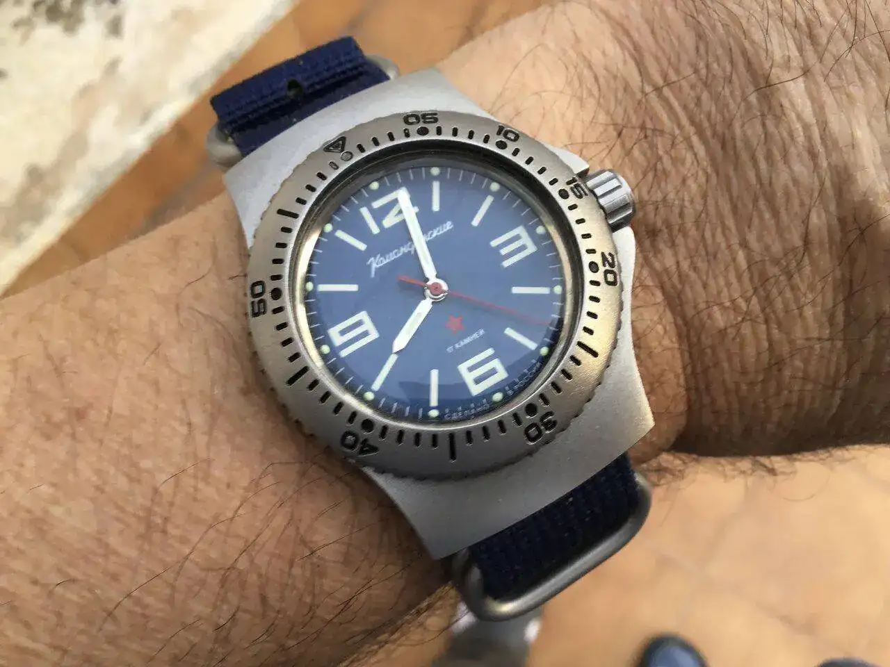 Hoy llevo este Vostok Komandirskie K-28 de cuerda. Os paso una mala foto recién tomada con el móvil.