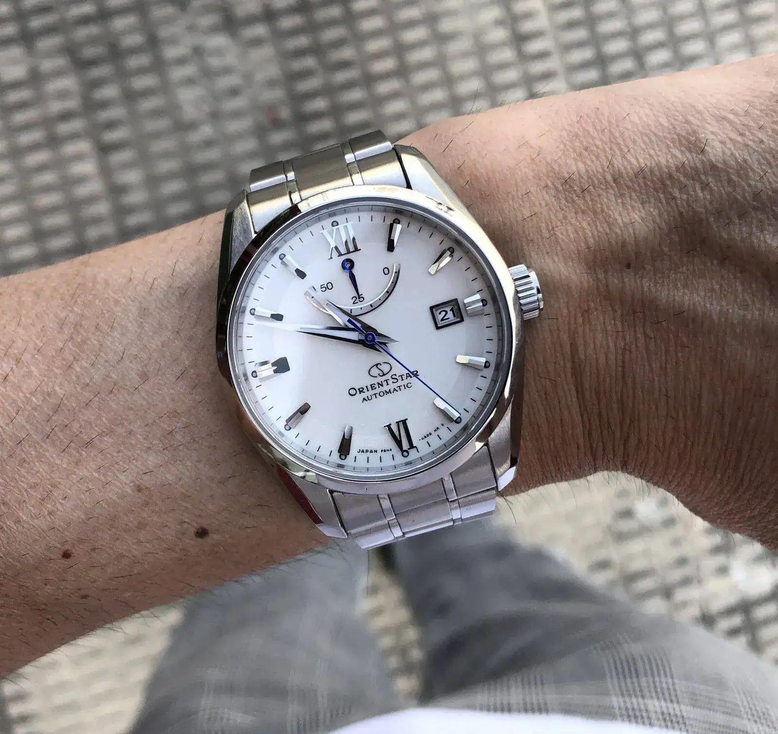 Precioso. Estuve detrás de este Orient Star Standard hace un tiempo, esta versión blanca es la que más me gustaba, y el azul y el negro eran también muy bonitos. Pero el blanco con sus matices de tonos y esas agujas azules me encantaba, bueno, me encanta. Al final se cruzaron otros y no se puede tener todo, pero qué bonito. Los apliques de las horas, espectaculares.Buenos días 🌞 señores