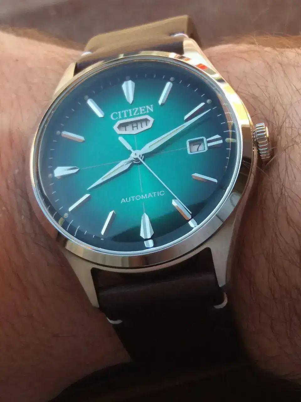 Precioso. ¿Es un modelo nuevo? Por el estilo no es moderno precisamente, pero por el tamaño, lo nuevo que está y algunos detalles ¿parece un modelo nuevo no? Me encanta el degradado d ela esfera, la mirilla con el día debajo de las 12, la forma de esa mirilla, la forma d elas agujas, y los índices de las 12, 3, 6 y 9 son preciosos. Seguro que además no es caro, ¿lleva un 82xx? Si Citizen ha sacado ahora relojes como ese ya tengo otro más en la lista.