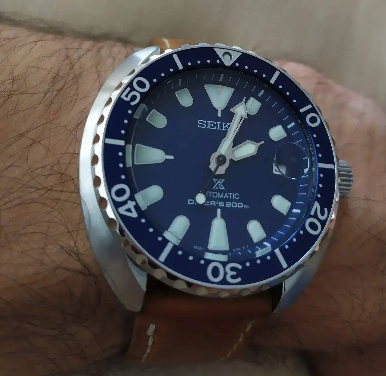 El Seiko es un 7A48 de diciembre de 1984, este mes cumple 38 años, ahí es nada. Me gustan mucho estos Seiko porque son de esos relojes de cuarzo con calibres de alta calidad, sabes que no llevas un cuarzo cualquiera, sino el primer calibre cronógrafo analógico de cuarzo de la historia, metálico, reparable, montado sobre 15 rubís y con ajuste de la marcha. Ya tengo un 7A38, pero hacía tiempo que quería este porque me gustan las fases lunares y me gusta el estilo clásico que tiene. Visto al natural es muy bonito, y se usa como si fuese un reloj nuevo a pesar de sus casi 40 años. La Luna y su cielo nocturno se ven grandes y muy bonitos. La ventaja de un Fases de la Luna de cuarzo es que siempre está funcionando, siempre puedes ver cuál es la fase, mientras que en uno mecánico, si no lo usas todos los días y lo dejas pararse, hay que ajustar la complicación para poder disfrutarla cada vez que vas a cojerlo. El único pero que le pongo a este Seiko es que los números de la fecha, alrededor de las fases lunares, son diminutos, pero es lo de menos. Os dejo una foto donde se aprecia también su bonito plexi abombado.