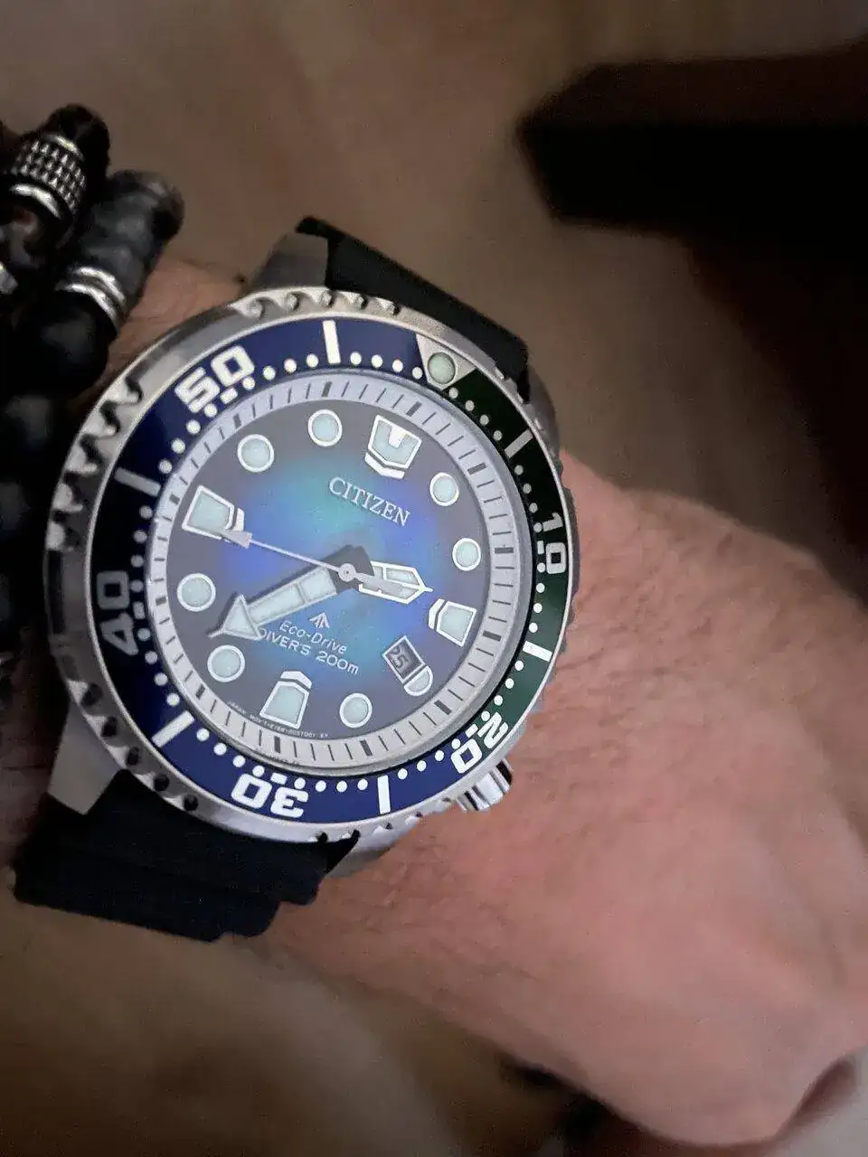 Un amigo de otro foro de relojes tiene un Citizen como este y es verdad, los colores son preciosos, varían según se mueve el reloj, aparecen verdosos, azules, como si tuvieses un trozo de mar debajo de la esfera, y por lo visto además no hay dos ejemplares con la esfera exactamente igual. Los japoneses hacen magia con las esferas.Ahí va el mío recién llegado…colores muy bonitos cuyos matices no se reflejan en las fotosVer el archivos adjunto 2686047Ver el archivos adjunto 2686048Ver el archivos adjunto 2686049