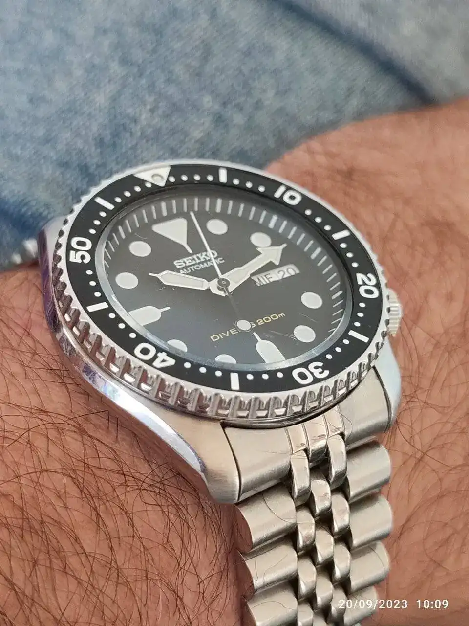 Es uno de mis relojes favoritos de una de mis marcas favoritas. Es como el reloj que mi madre regaló a mi padre para su boda en 1972, el Orient World Diver calibre 1942 con esfera negra. Se empezó a fabricar en 1967, y se fabricó con este calibre antiguo hasta 1973; a partir de ahí se fabricó durante pocos años más con el calibre un poco más moderno, y a la postre verdadero monumento de Orient, el 469. Se diferencian muy fácilmente porque las versiones antiguas como el mío y el que aún conserva mi padre, con el calibre 1942, tienen las ventanillas de día y fecha separadas, a las 9 y a las 3 como ves en las fotos, mientras que el World Diver más moderno con calibre 46941 tenía una sola ventanilla a las 3 con el día y la fecha. También se hizo en muchos colores de esfera, algunos muy espectaculares propios de los 70, y al final de su vida comercial dejó de poner World Diver en la esfera para poner solo WD.