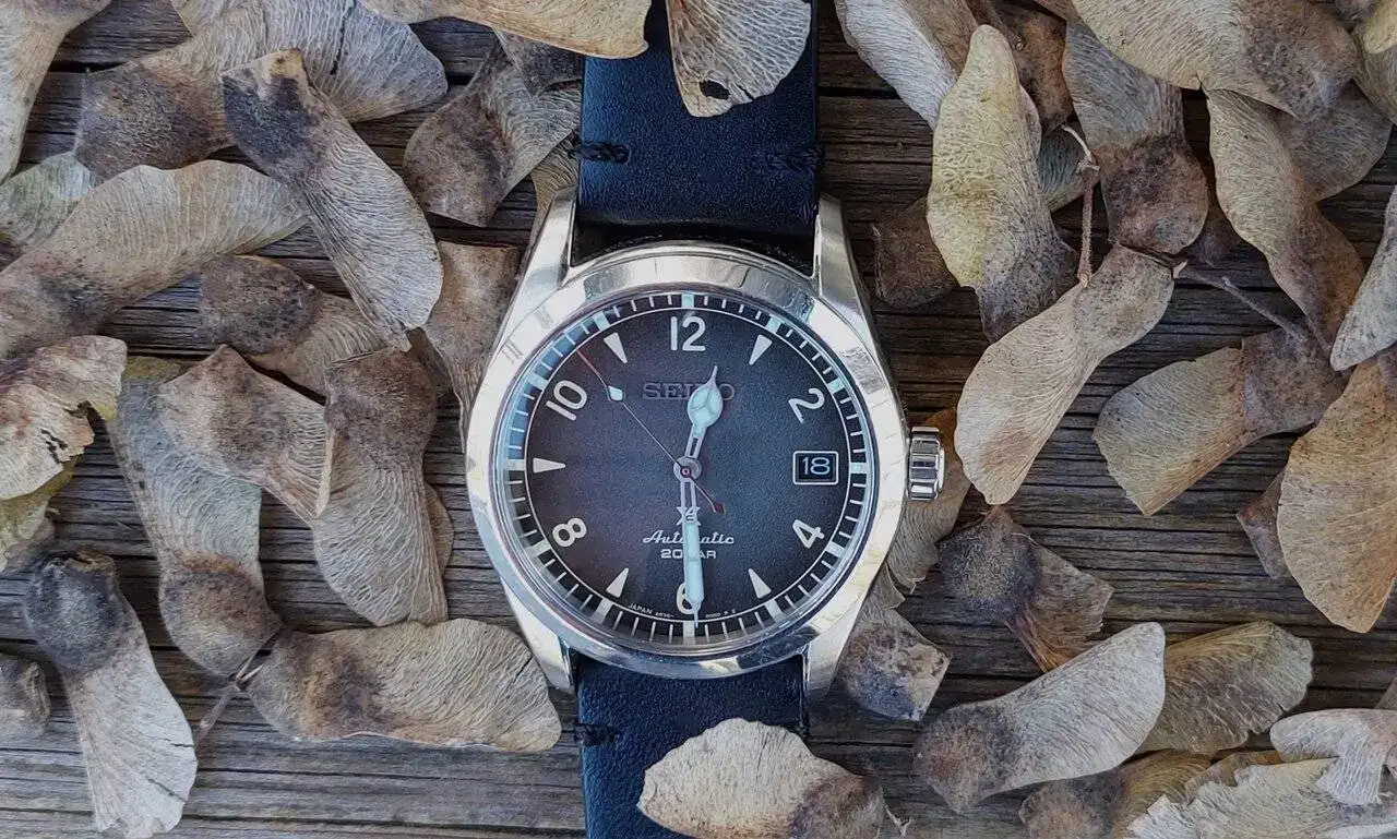 Seiko baby alpinist rodeado de semillas de arce. Preciosa imagen.