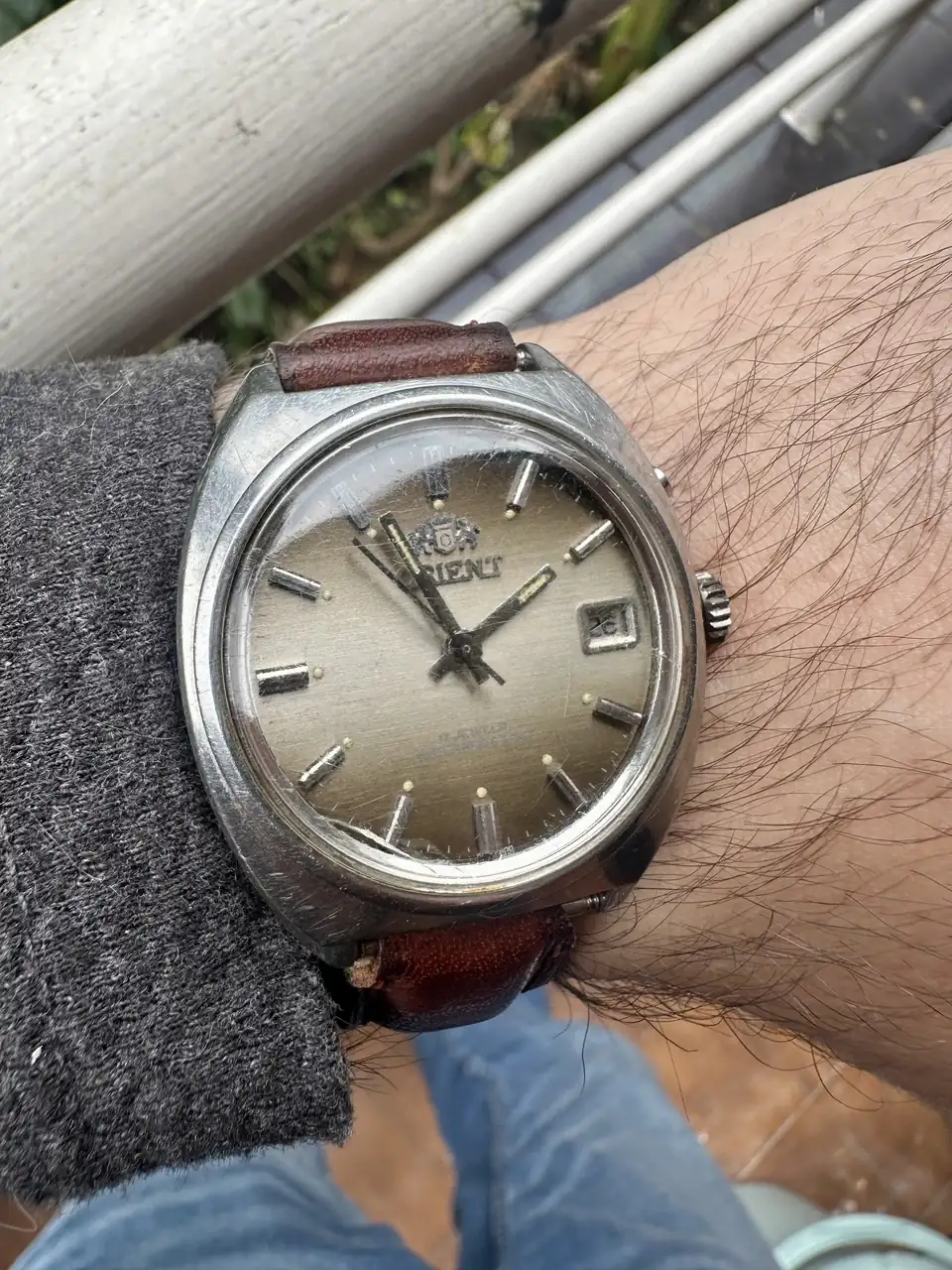 Bonito Orient clásico. Pero yo no sé si le cambiaría la esfera. Muchas veces parece que las esferas están peor de lo que realmente están, y es por culpa del plexi lleno de arañazos. Los arañazos del cristal no dejan ver bien la esfera, además proyectan muchas sombras sobre ella que parecen defectos en la esfera, y hasta hacen que parezca hecha polvo. Pero en no pocas ocasiones, al desmontar un reloj así, sacas el calibre con la esfera fuera de la caja y te llevas la sorpresa de que está mucho más nueva de lo que parecía.Hoy le toca salir al abuelo, un viejo Orient de los ‘70 (no tengo mucha información, solo sé que me lo regaló uno de los tios de mi madre hace ya muchos años). Por lo que he podido averiguar data sobre los ‘70. Le doy cuerda un par de veces al día y a tirar millas. El pobre necesita una buena dosis de chapa y pintura. Esta semana lo llevo al relojero a ver si le pueden poner una esfera nueva, y ya si me lo pulen sería la guinda del pastel.