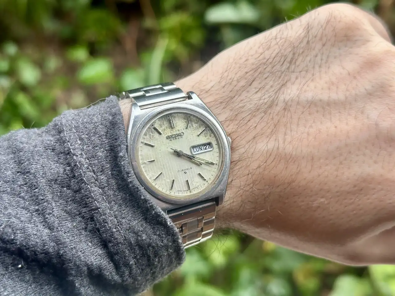 Te animo a que le hagas ese mantenimiento, es un reloj muy agradecido, y muy bonito! 😊Hoy un Seiko del 77’. Fue de mi padre, lo encontré literalmente tirado en el suelo del trastero de la casa del pueblo. La esfera está deteriorada por la humedad, no creo que tenga reparación, ahora bien en cuanto lo cogí para verlo el calibre volvió a la vida. Seguramente requiera un mantenimiento, porque noto que la masa oscilante no gira fina.