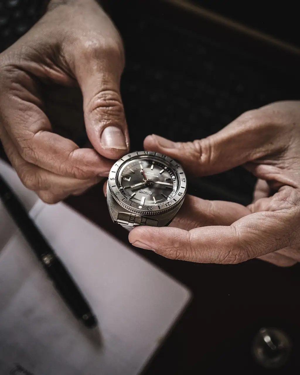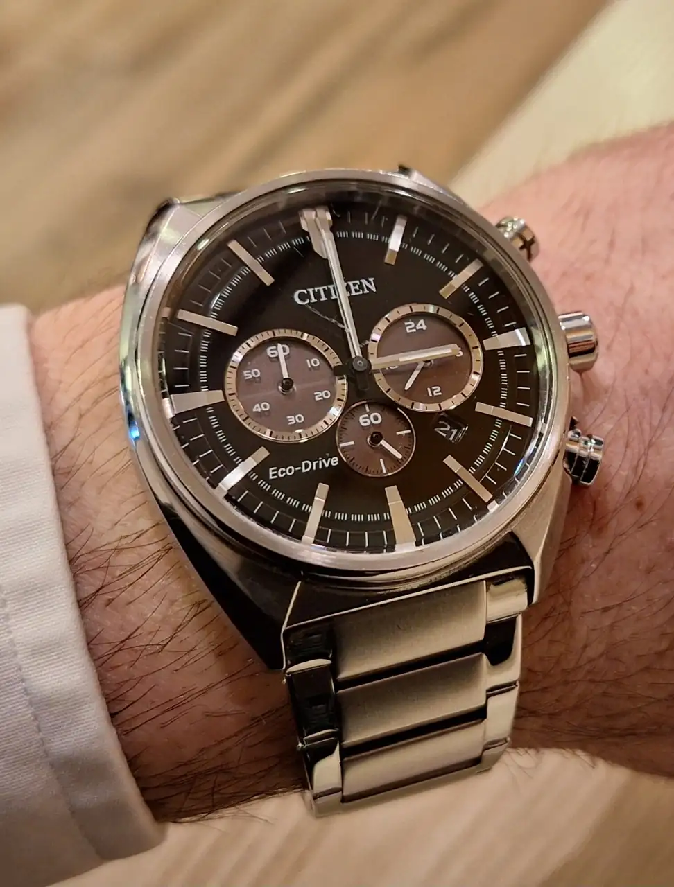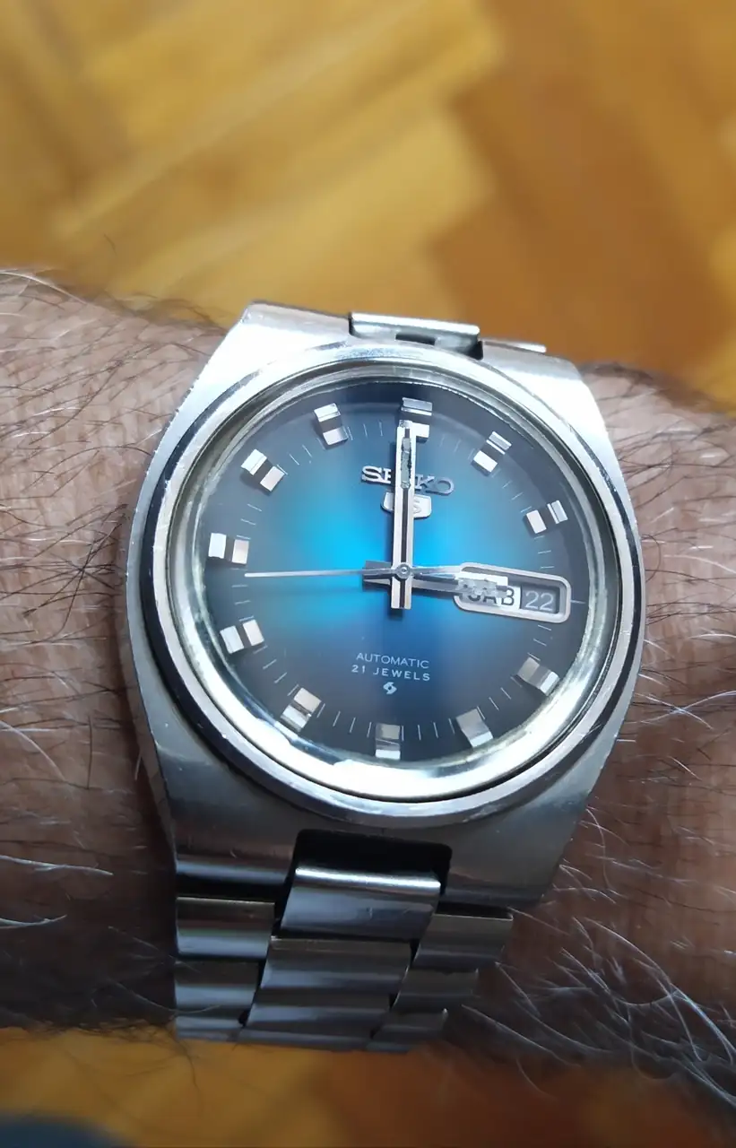 Una herencia de mi suegro, que trabajaba de transportista y le dio un buen trote. Luego estuvo más de diez años en un cajón. Cuando lo recuperé solo tuve que menearlo y se puso en marcha con una precisión alucinante, retrasa menos de ocho segundos al día. Lo único que no funciona es el cambio de día de la semana, el de la fecha sí. Y lo único que no es original es el plexi, que cambié porque esta muy rayado.Da gusto ver relojes de esa epoca en ese estado.