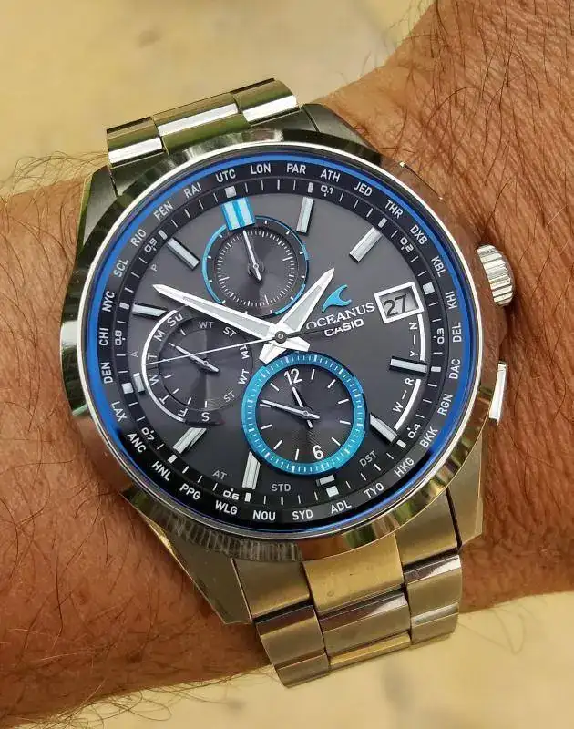 Oceanus Casio T-2600, un año con él e impresionado todavía por su cristal de zafiro tan transparente y los tonos azules que coje según le incide la lúz. Asombrado con la recepción de radiocontrol, normalmente lo hace a diario en el norte de donde soy, pero es que me recepciona igualmente por las provincias del sur que estoy visitando, Granada, Málaga o Sevilla 👌👌👌