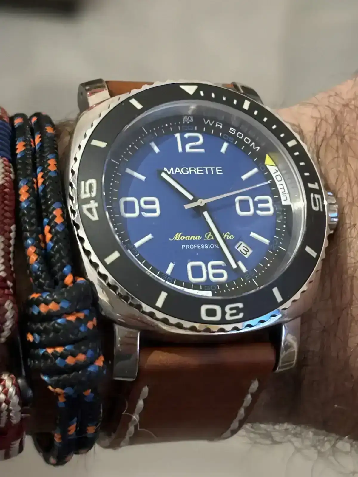 Creo recordar que es de 43mm, el movimiento es un Miyota 8, que no me ha ido nada mal y el reloj lo tengo desde hace más de 10 años. Es muy pinton y admite juego con diversas correas (muy estilo Panerai) en su día creo que me costó, con envío, sobre 350 euros. De hecho tengo también el caucho original con deplorable y una correa de cuero de la marca con ardillon en color gris.