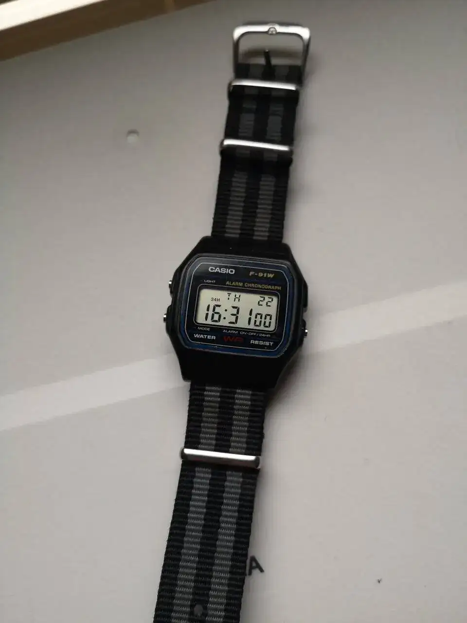 Uno de los escasos defectos de Casio es las correas que se desintegran, así que puedes darte con un canto en los dientes por poder poner una NATO a un F-91, porque yo creía que no se podía, era uno de los problemas de este reloj, que el cambio de correa estaba difícil por la holgura que había para los pasadores o algo así.