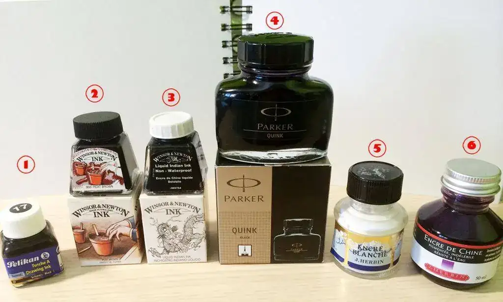 3: Winsor & Newton - Tinta india negra: Igual que la Pelikan (nº1) (Le cambié el tapón porque el original estaba rajado)