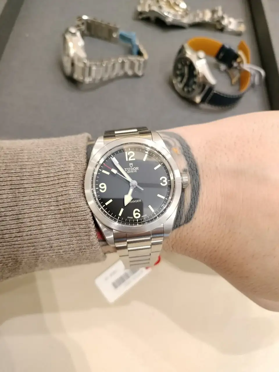 Parece una bobada, por tan poca diferencia, pero se nota. Las dos veces que fui a probármelo, llevé puesto el Sandhurst (que es de 38mm), que es un reloj muy parecido en el concepto, y se veía una notable diferencia entre ambos. El perfil tan liso de la carrura del Ranger, y sus asas más largas marcaban la diferencia. Y además, la cantidad de "espacio negativo" en el dial del Ranger también hace que se vea más grande, al tenerlo menos ocupado.