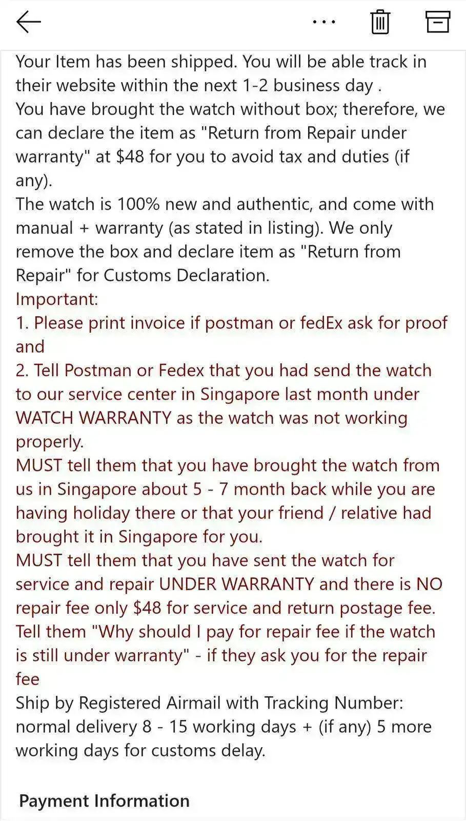 Compré tiempo atrás un Seiko con muy buena experiencia a mywatcheshub.com watcheszon . Ellos me enviaron esto para evitar aduanas ....y no pagué. Y leyendo pues parece que mucha gente tampoco .