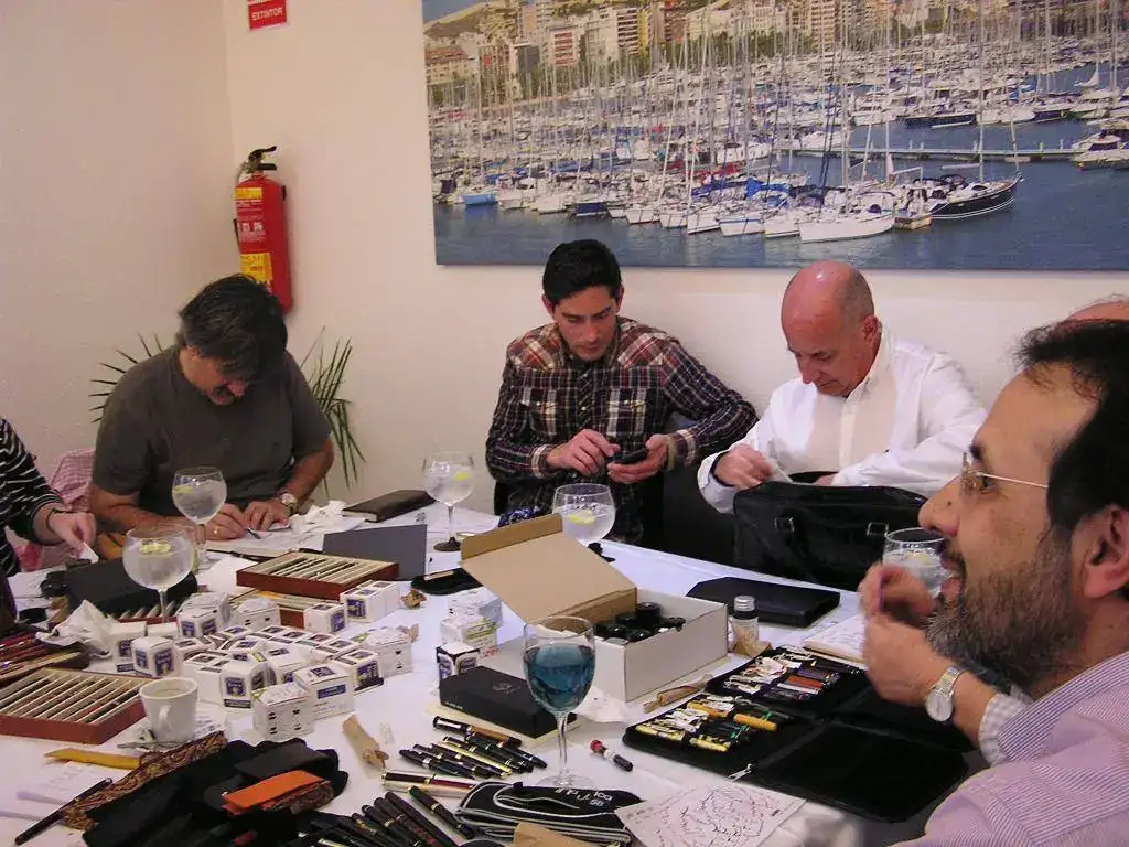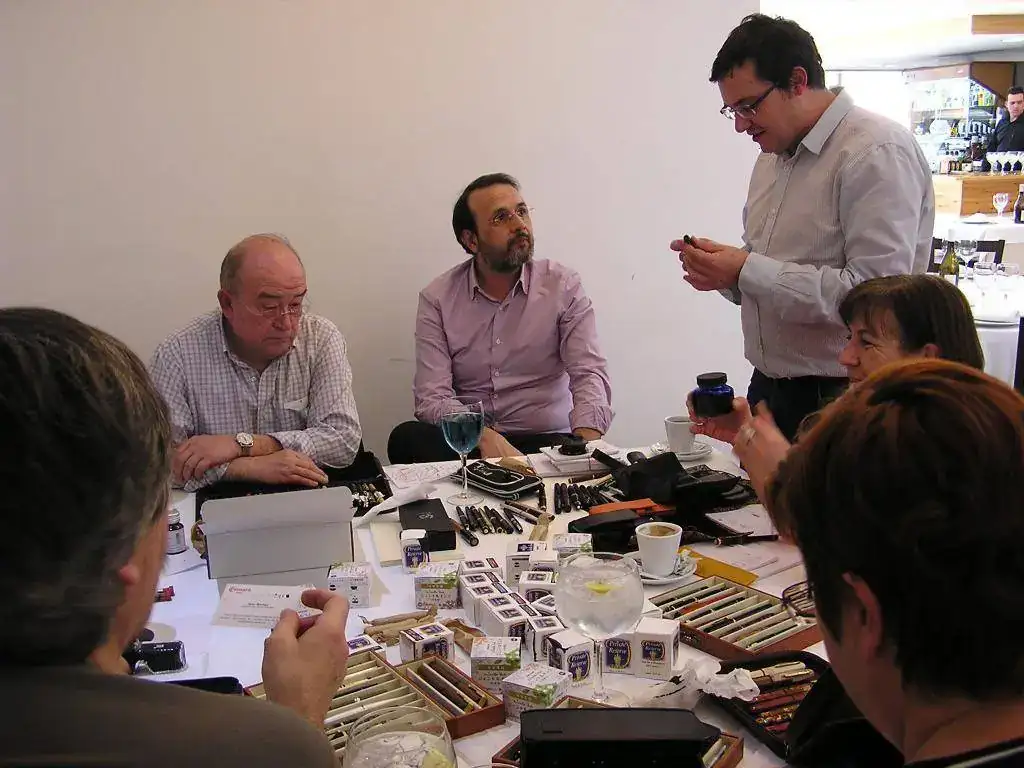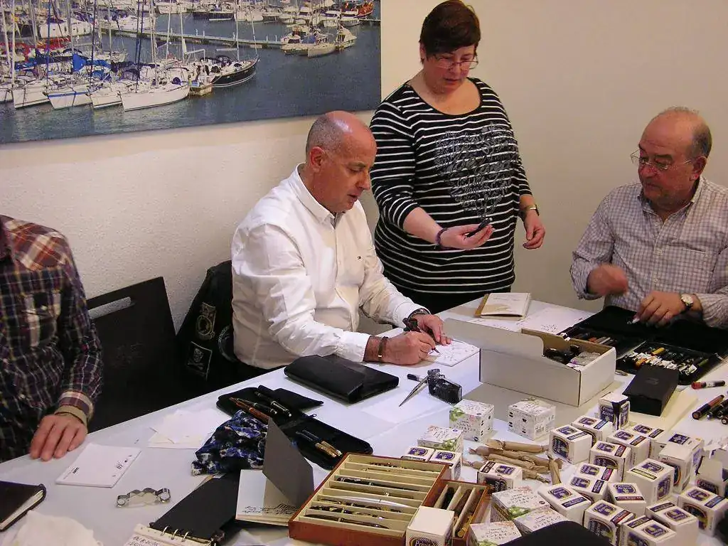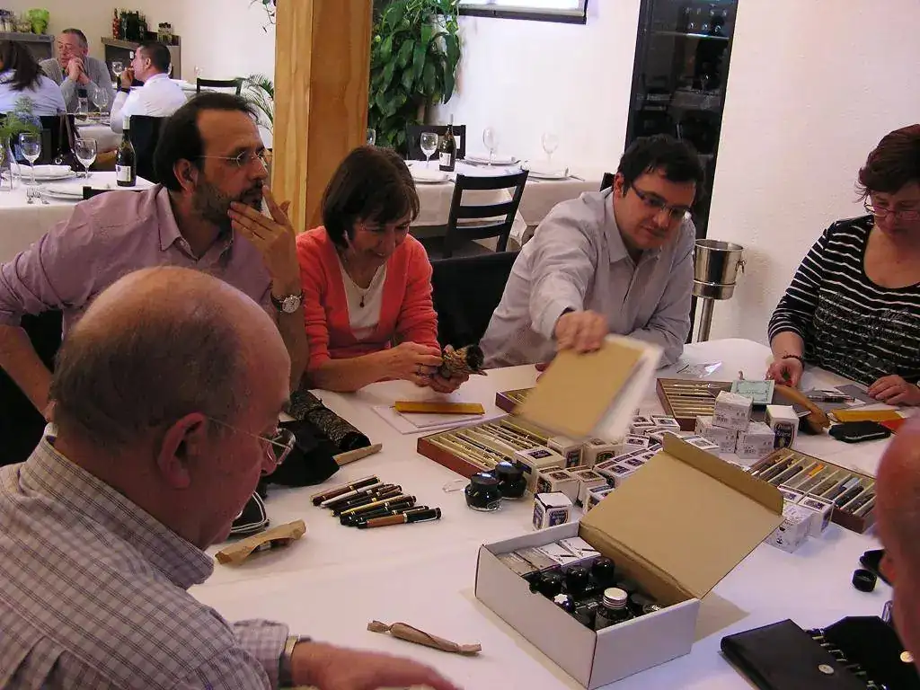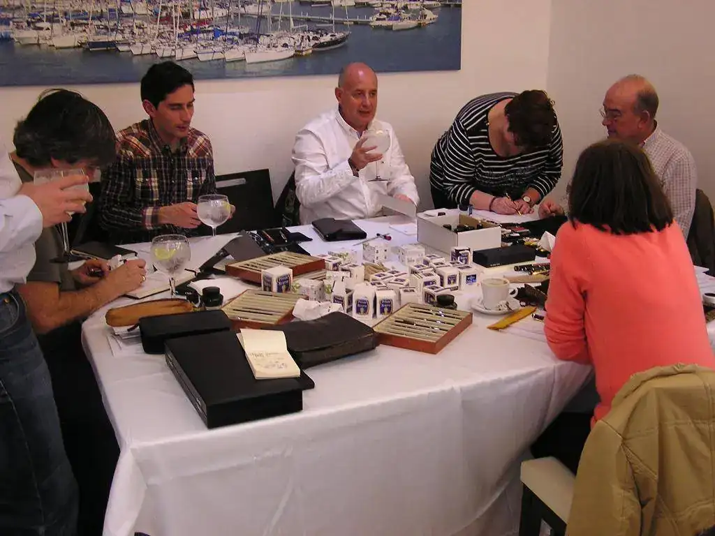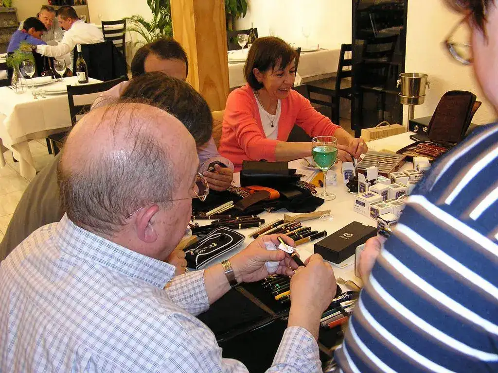 Pedro nos obsequió con fundas, que incluían una pluma, y tinteros, así como blocs de papel; Pepe, nos regaló unos viales de tintas y todos disfrutamos de la visión, el tacto y la escritura de piezas excelentes. Por ejemplo, Pedro nos enseñó y dejó probar unas Romillo fuera de serie (literalmente, plumas exclusivas), y salvo las mías que eran bastante normalitas, Ernesto, Mauricio, Pepe, Alfonso, Javier y Zaida compartieron piezas que sólo en estas reuniones se ven, al menos por mi parte. Veamos algunas fotos, sin comentarios: