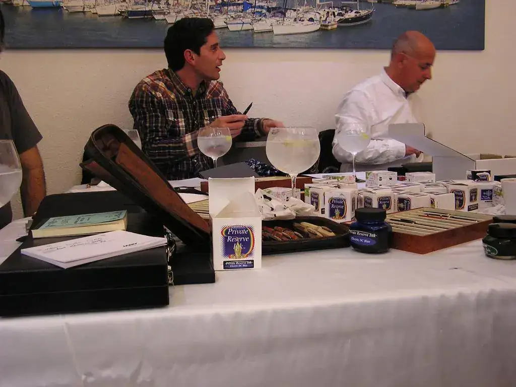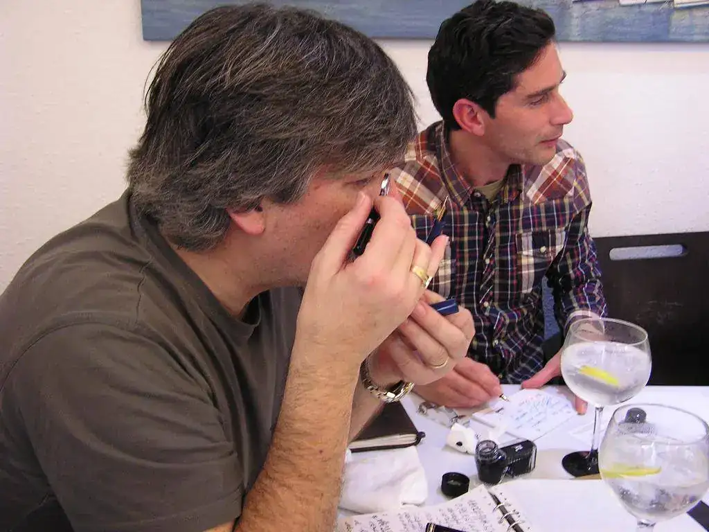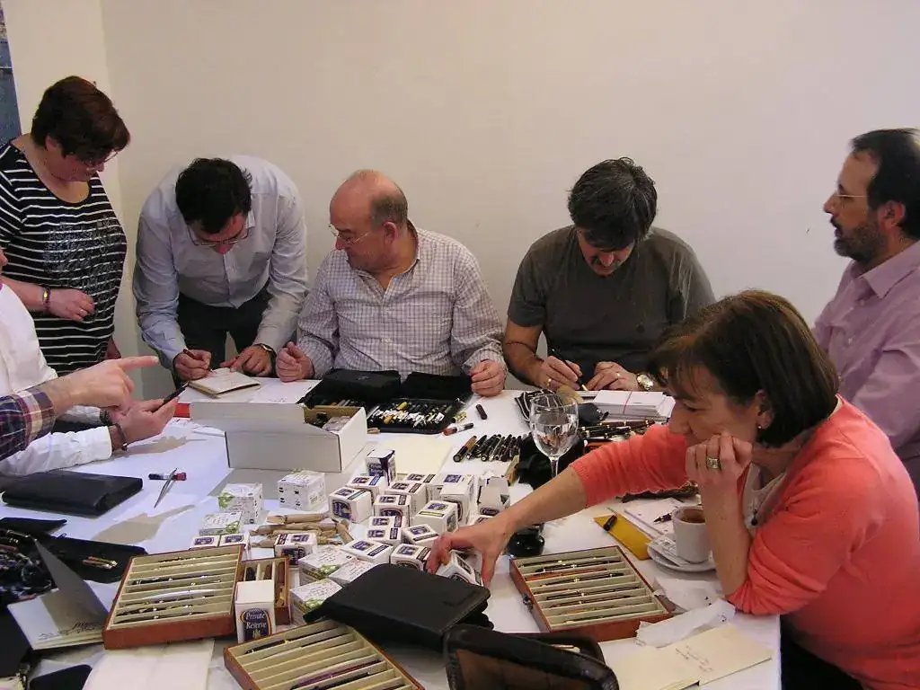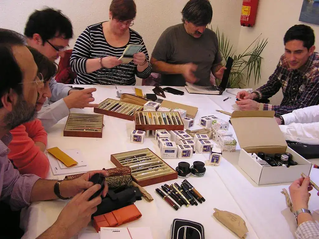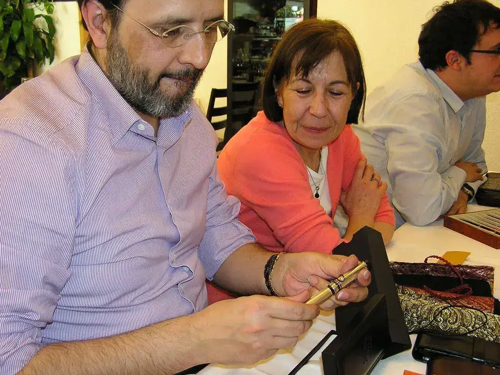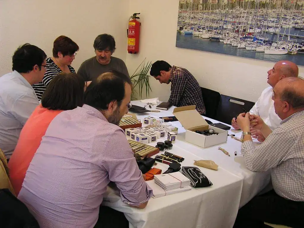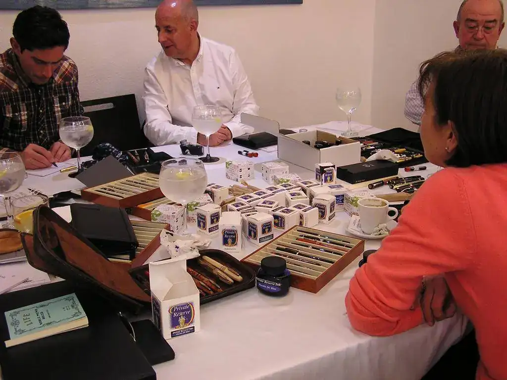 Pedro nos obsequió con fundas, que incluían una pluma, y tinteros, así como blocs de papel; Pepe, nos regaló unos viales de tintas y todos disfrutamos de la visión, el tacto y la escritura de piezas excelentes. Por ejemplo, Pedro nos enseñó y dejó probar unas Romillo fuera de serie (literalmente, plumas exclusivas), y salvo las mías que eran bastante normalitas, Ernesto, Mauricio, Pepe, Alfonso, Javier y Zaida compartieron piezas que sólo en estas reuniones se ven, al menos por mi parte. Veamos algunas fotos, sin comentarios: