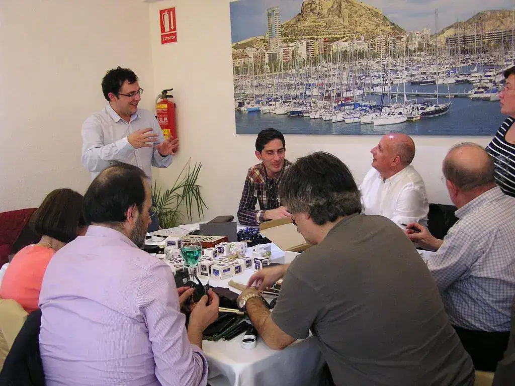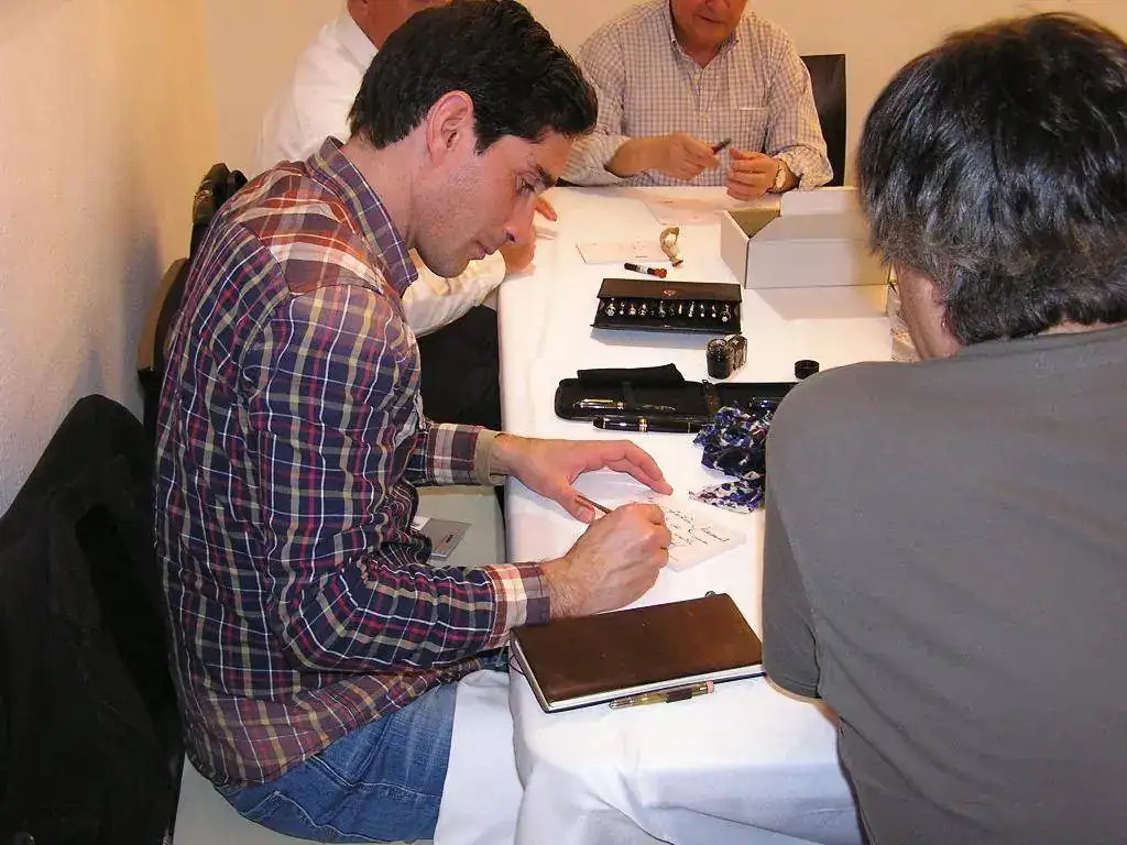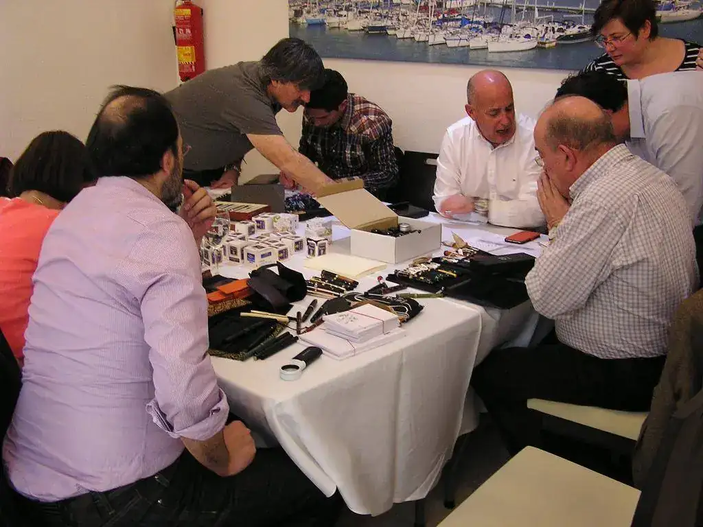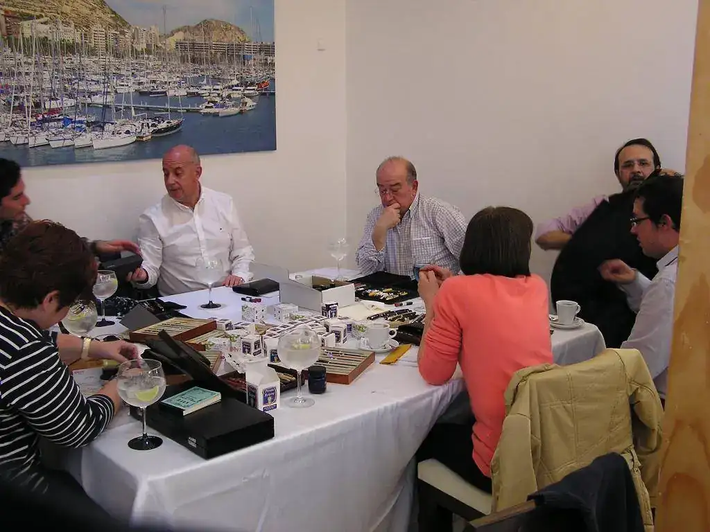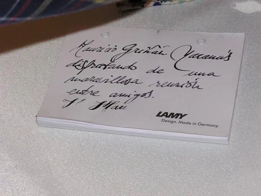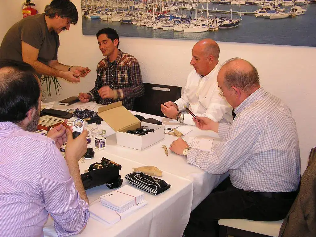 Pedro nos obsequió con fundas, que incluían una pluma, y tinteros, así como blocs de papel; Pepe, nos regaló unos viales de tintas y todos disfrutamos de la visión, el tacto y la escritura de piezas excelentes. Por ejemplo, Pedro nos enseñó y dejó probar unas Romillo fuera de serie (literalmente, plumas exclusivas), y salvo las mías que eran bastante normalitas, Ernesto, Mauricio, Pepe, Alfonso, Javier y Zaida compartieron piezas que sólo en estas reuniones se ven, al menos por mi parte. Veamos algunas fotos, sin comentarios: