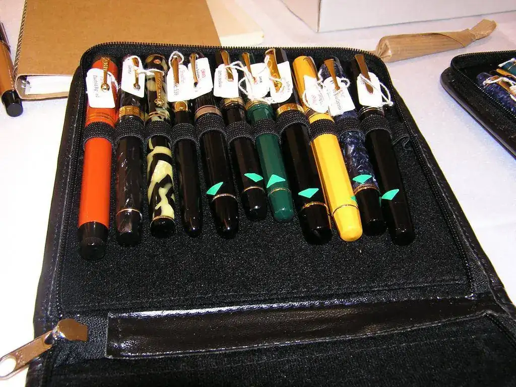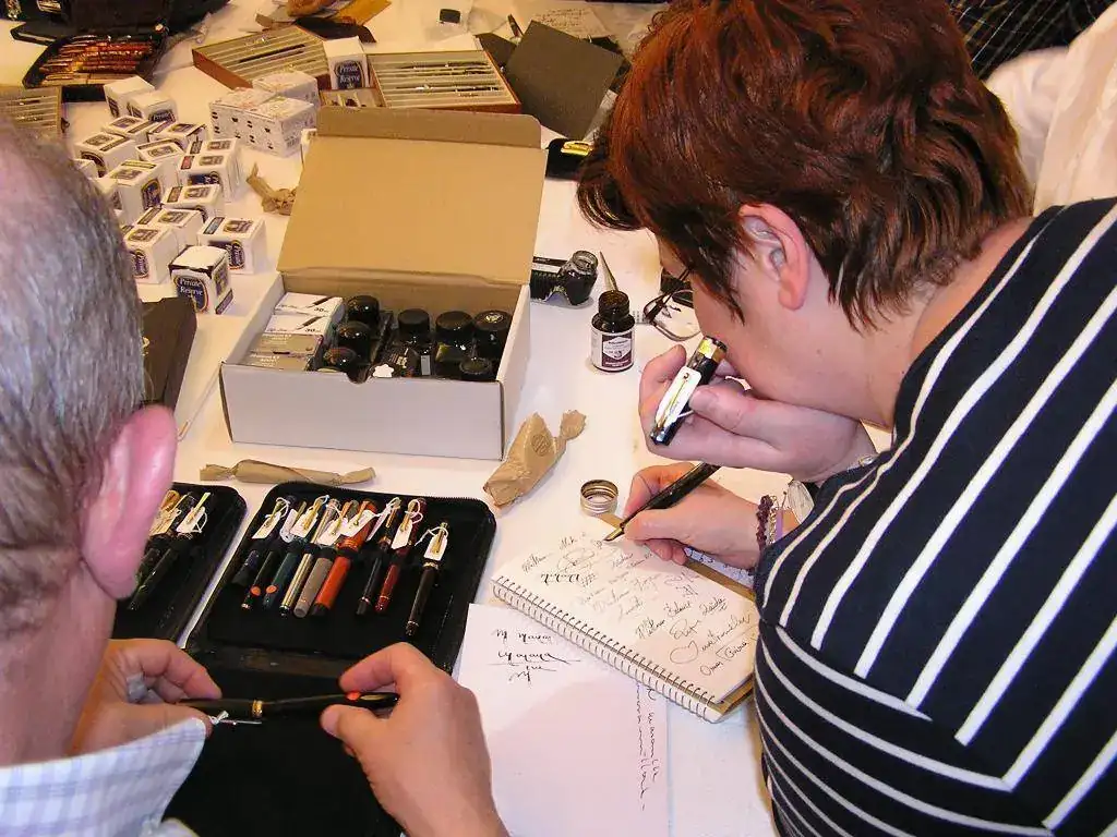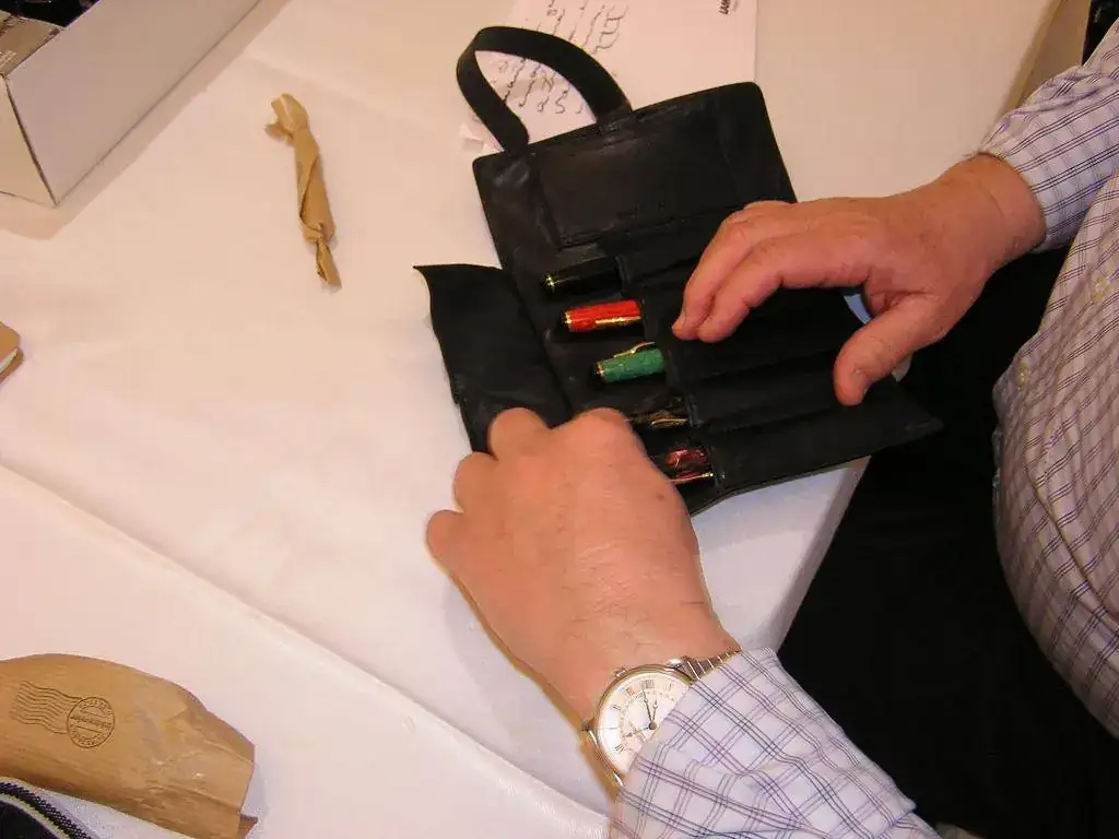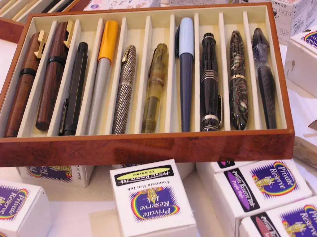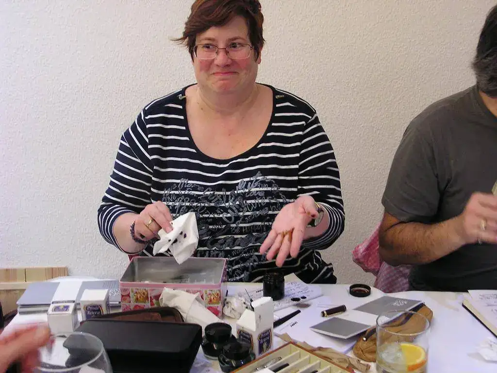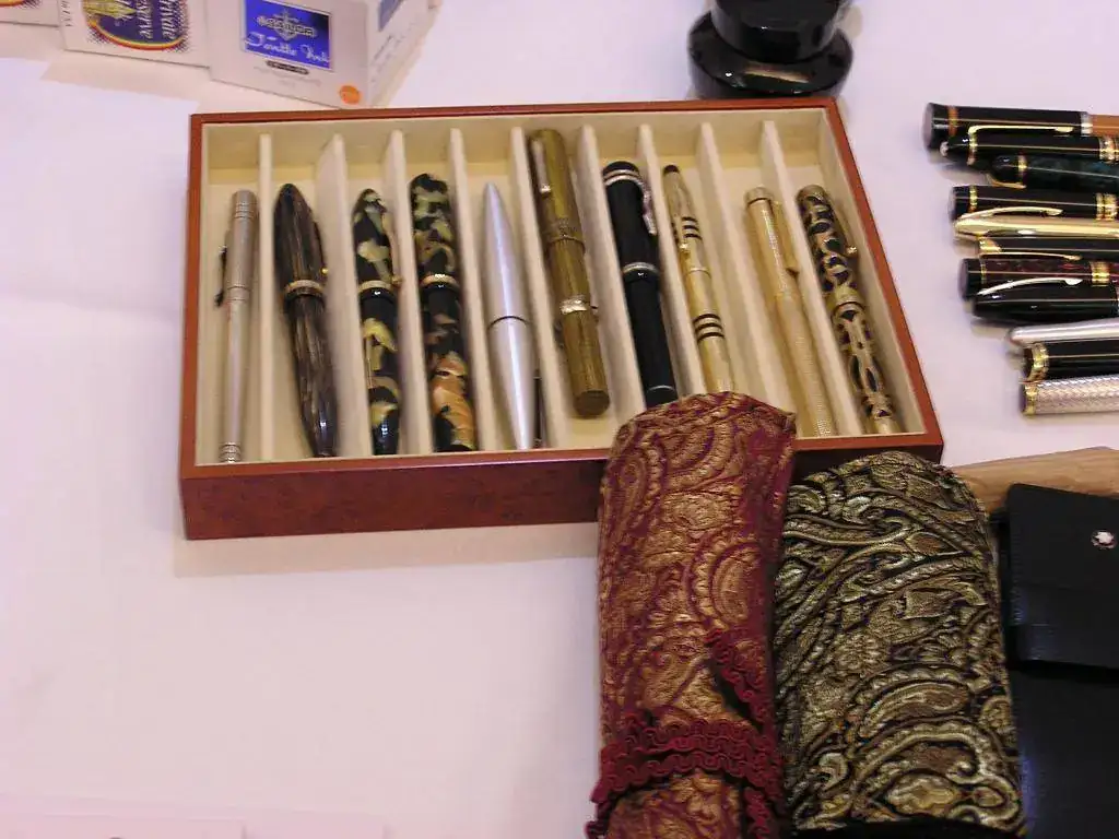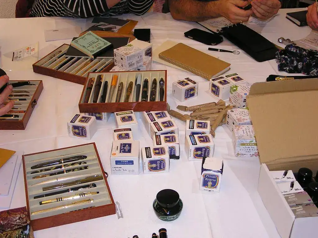Pedro nos obsequió con fundas, que incluían una pluma, y tinteros, así como blocs de papel; Pepe, nos regaló unos viales de tintas y todos disfrutamos de la visión, el tacto y la escritura de piezas excelentes. Por ejemplo, Pedro nos enseñó y dejó probar unas Romillo fuera de serie (literalmente, plumas exclusivas), y salvo las mías que eran bastante normalitas, Ernesto, Mauricio, Pepe, Alfonso, Javier y Zaida compartieron piezas que sólo en estas reuniones se ven, al menos por mi parte. Veamos algunas fotos, sin comentarios: