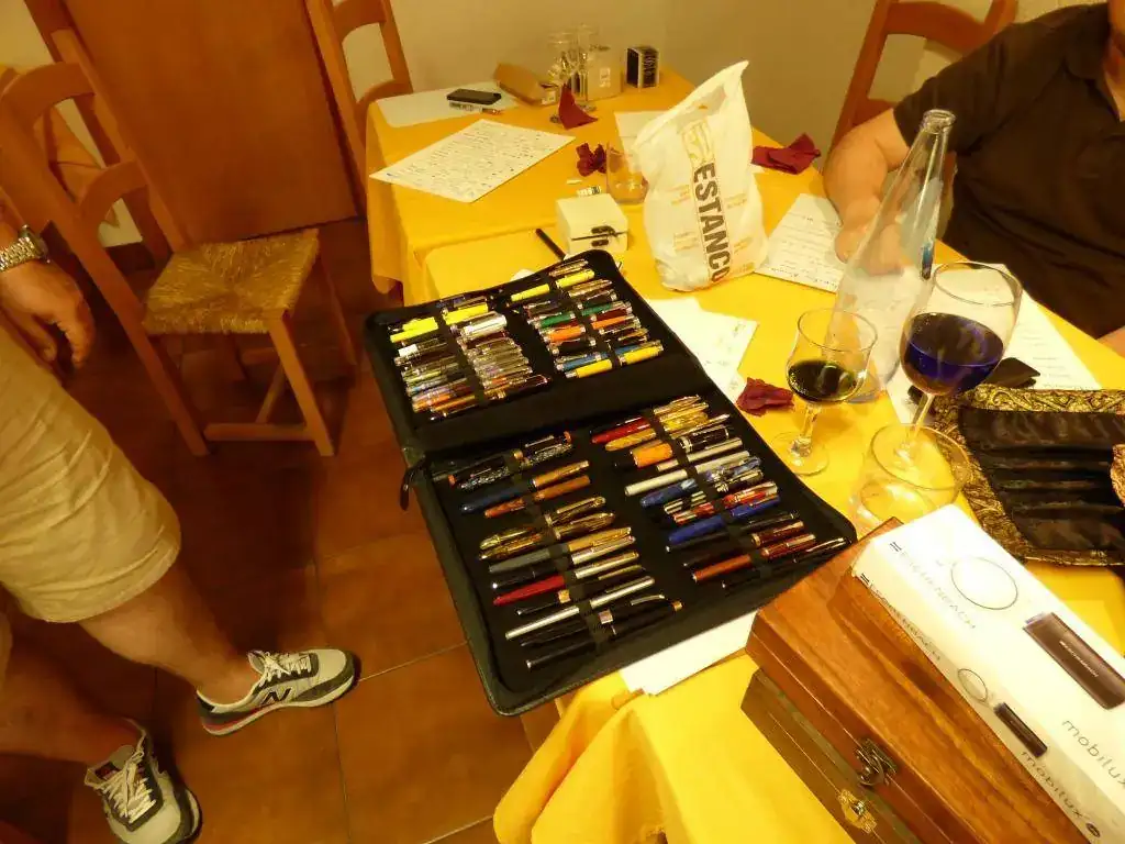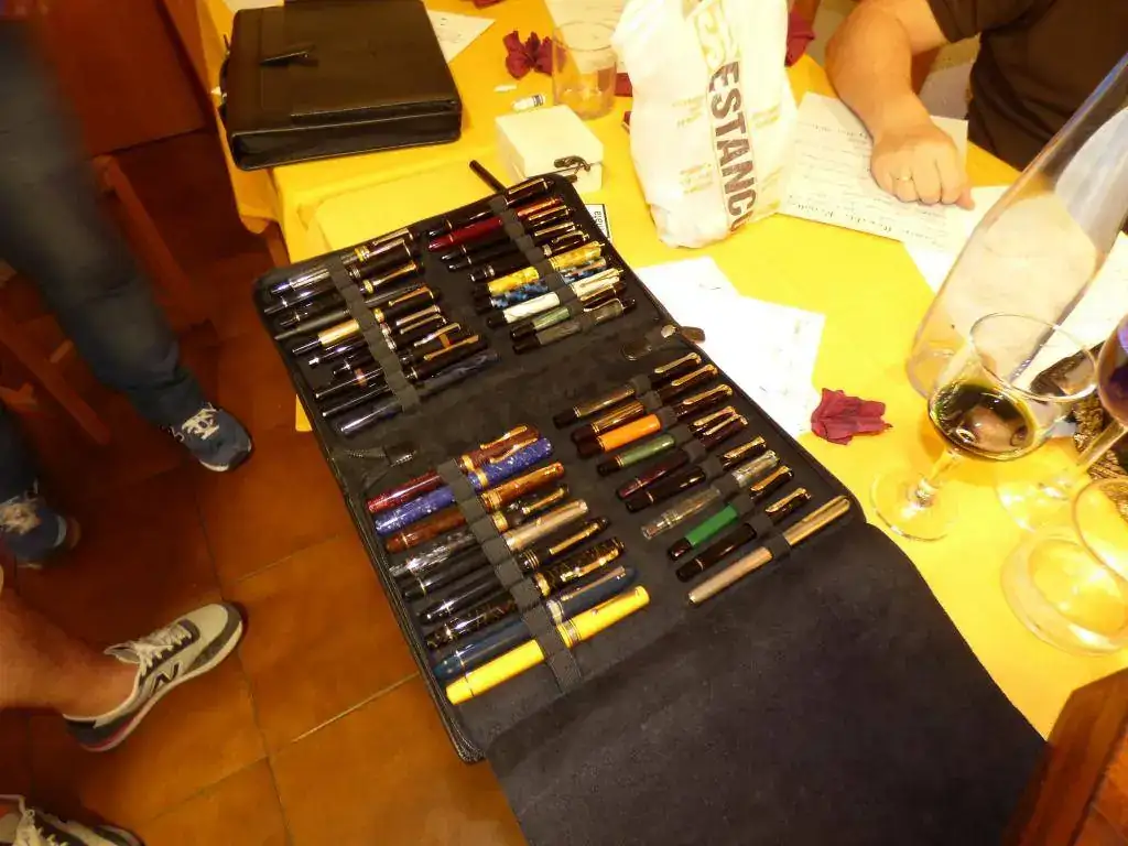 Pedro (PedroHaddock) No pudo quedarse a comer, retenido por obligaciones familiares. Presentó un elenco de estilográficas absolutamente raras y preciosas, entre ellas la Aurora Carey, por la que estaría dispuesto a algún pecado mortal.