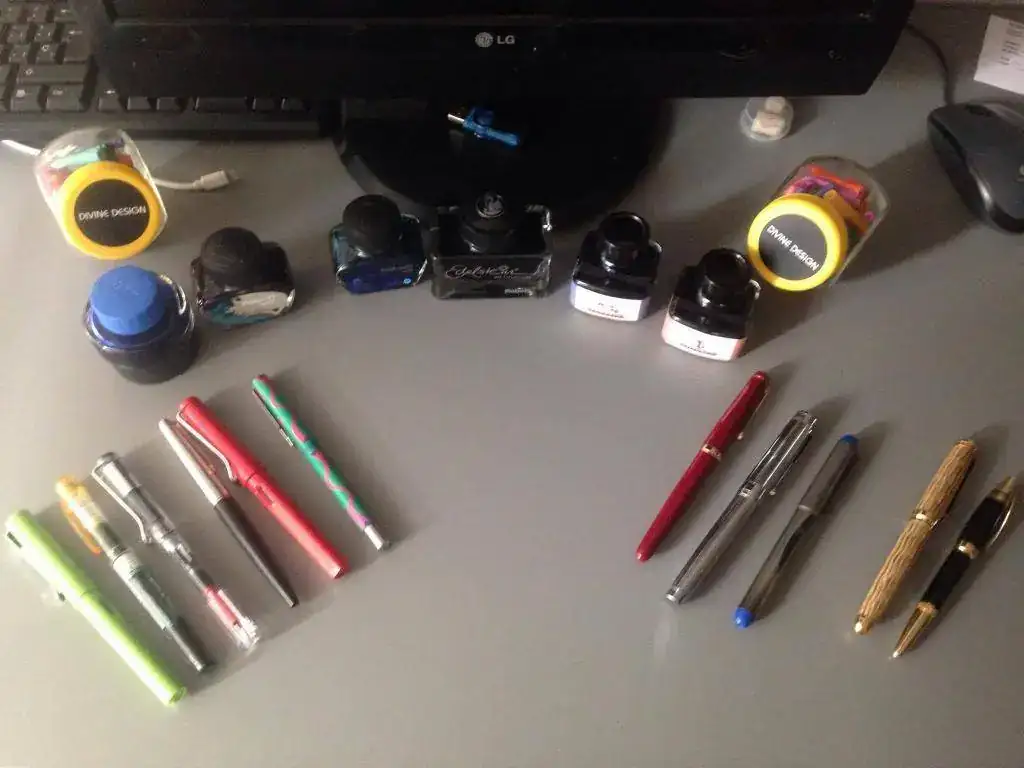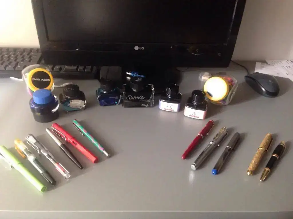 Lo primero de todo pediros disculpas por la calidad las fotos estas tomadas con la cámara del Iphone (y no da para más). Pues después de estar un tiempo por aquí quería presentaros todo mi ajuar hasta el momento, alguna pieza estará sobrevolando china para llegar a mi casa este preciso momento. Es una colección bastante modesta mi economía de estudiante solo me permite compararme estilográficas de bajo precio. Las mejores piezas y que sin duda más utilizo para escribir mis trabajos (debo ser de las pocas personas que con 24 años tiene que escribir a mano todos los trabajos o al menos toda la estructura y contenido y luego pasarlo al word, cada vez es más difícil ahora tengo que hacer unas 200 págs.) son las dos Lamys (safari y vista) con sus recientemente estrenados plumines EF, la Parker 45 y la preppy. Las otras como la imitación de la Lamy o la Parker vector las tengo para algún tipo de anotación, subrayado etc..., las demás apenas las utilizo, algunas por ser muy malas compras como las dos de la derecha y otras porque no me gustan para escribir mucho rato pesan y se resiente la mano.