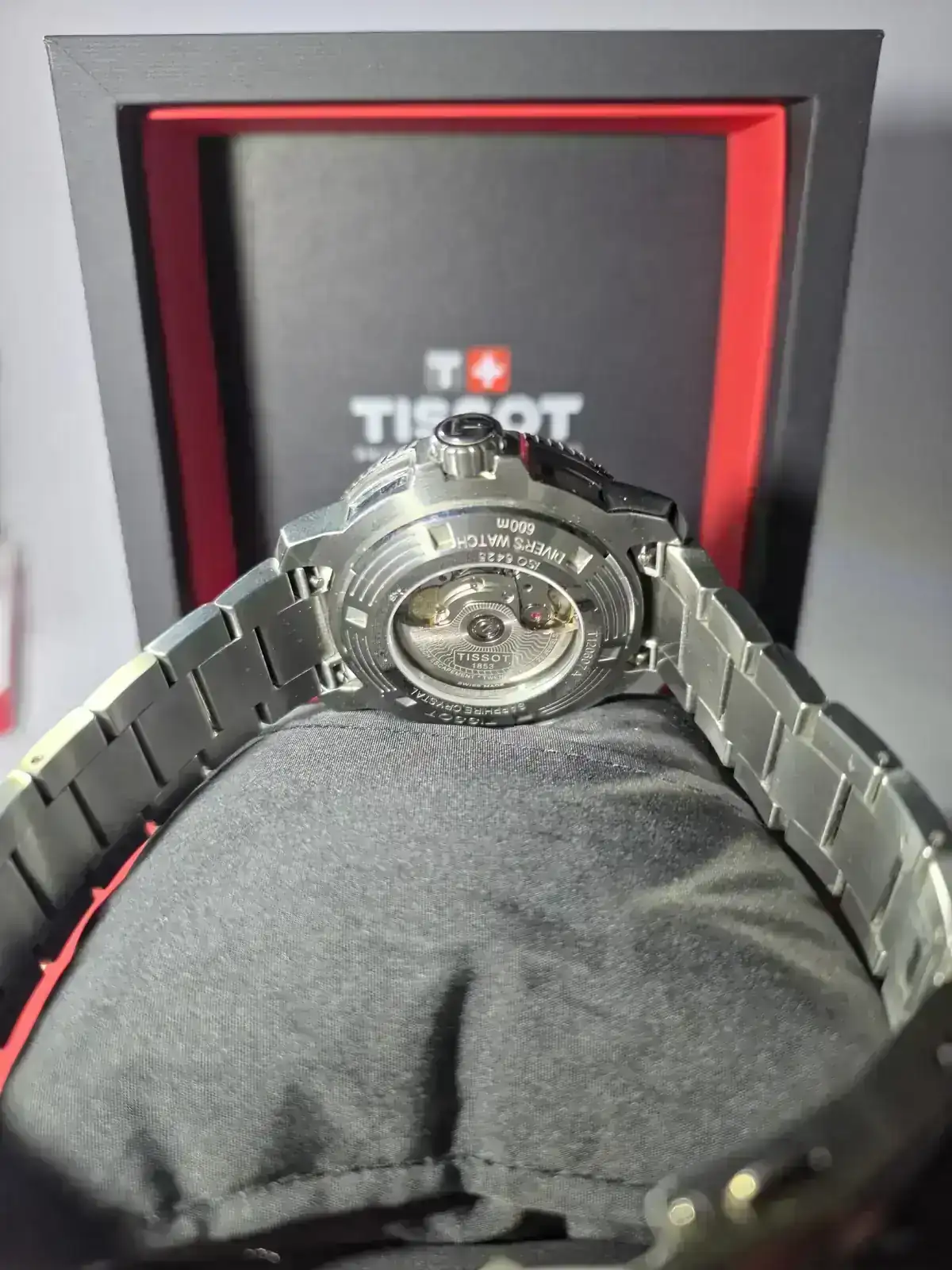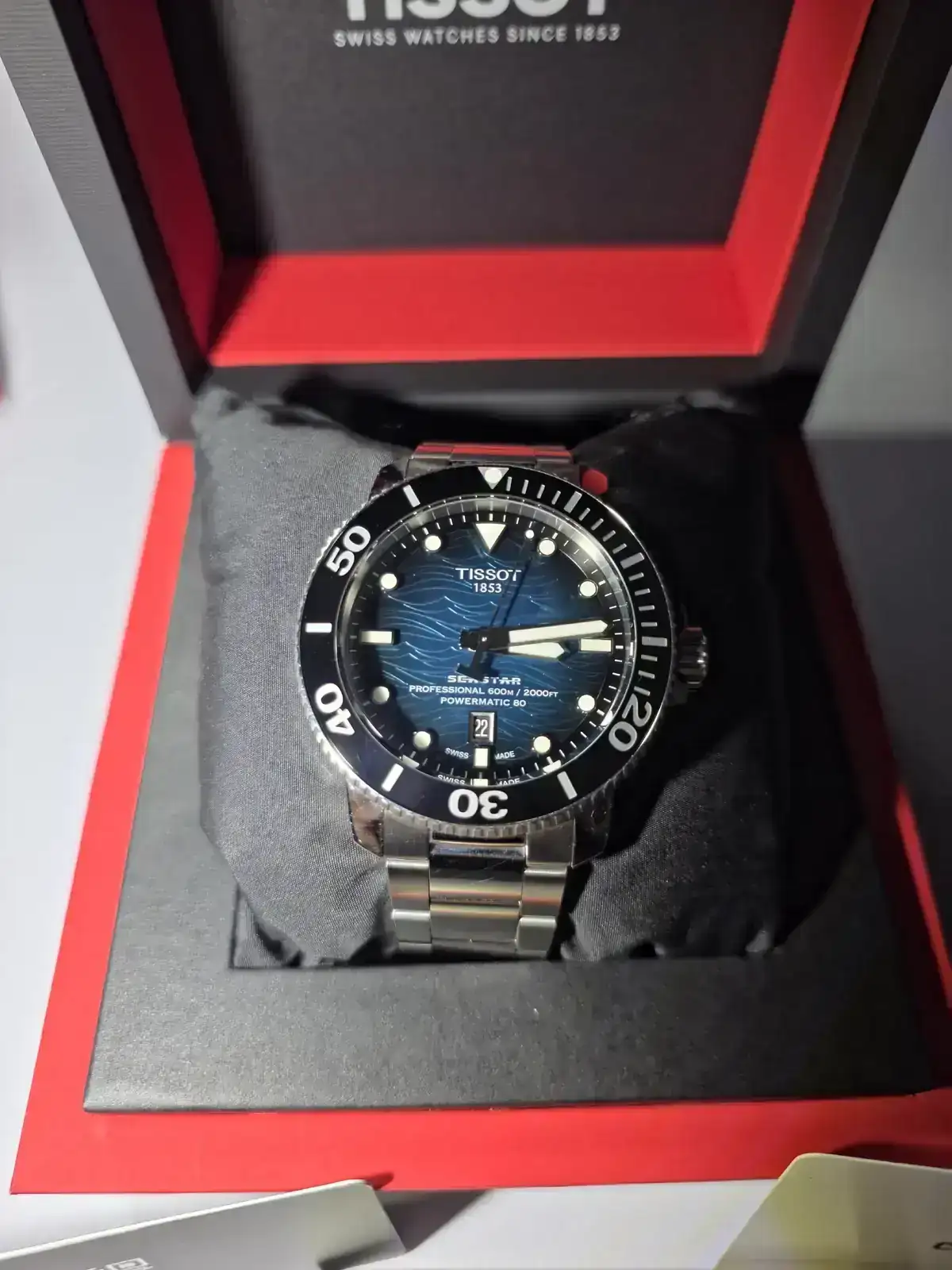 Este es el precioso tissot seastar 2000 , una pieza increible , cristal zafiro, bisel ceramico , dial texturizado con olas , movimiento powermatic 80 con 80 horas de reserva de marcha , extension de buceo , un excelente packagin , ah! Valvula de helio ....de todo y por un precio absolutamente increible.....y swiss made....