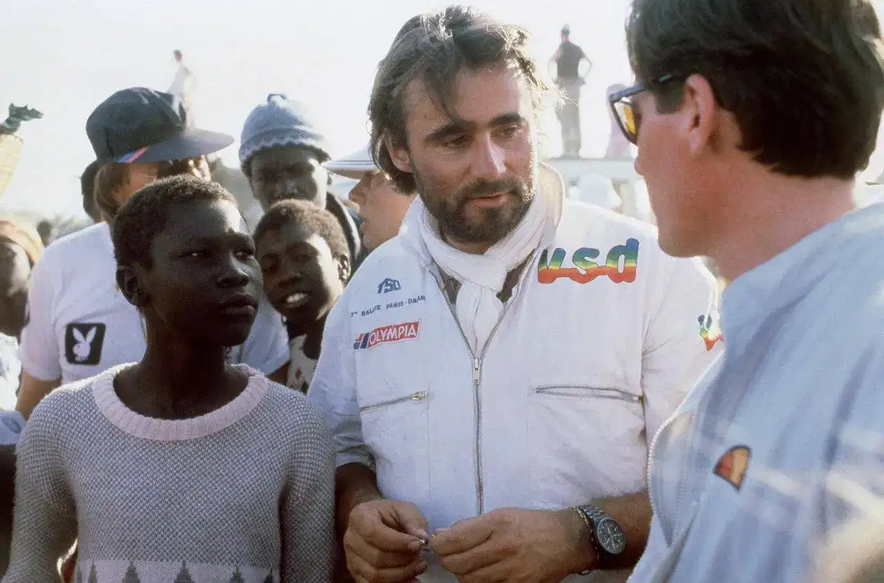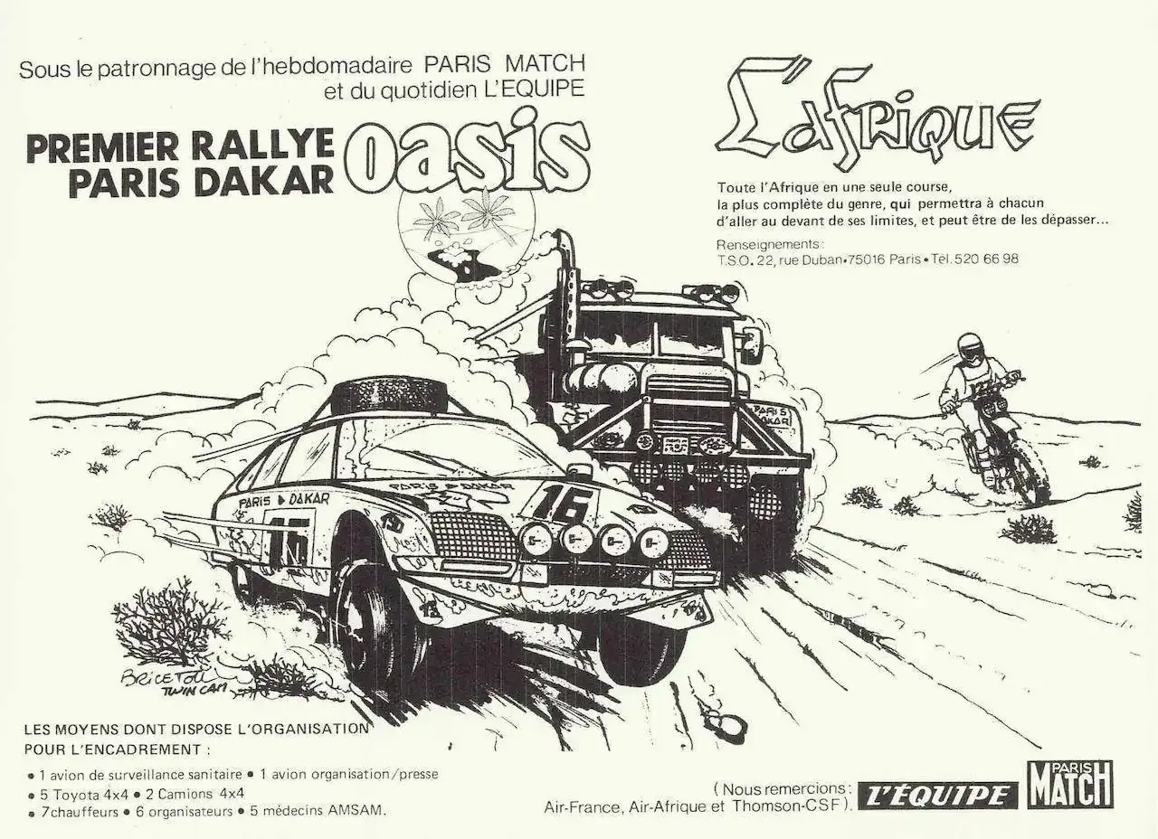 Todo se inició en 1983, durante la quinta edición de la carrera. En ese momento el París-Dakar ya se había convertido en una cita anual muy esperada tanto por los fanáticos del motor (como este que os está torturando con este relato 😇), fabricantes y tripulaciones más o menos expertas, así como por toda clase de playboys acaudalados siempre en búsqueda de emociones fuertes. Y, naturalmente, con ellos empezaron a interesarse en la carrera marcas de artículos que no tenían nada que ver con el motor, pero que veían en la alta exposición de las imágenes que se trasnmitían durante todo un mes en todas las televisiones mundiales, un escaparate muy atractivo para promocionarse ante un target muy amplio y novedoso, incluso en mercados incipientes (recordemos que el mundo era muy diferente hace 40 años: la URSS seguía encerrada monolíticamente, en China no había más que bicicletas y camisas con cuello Mao, y, en general, la vida en todo el globo era todavía analógica).