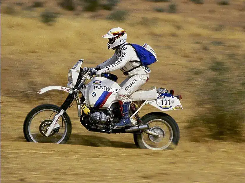 Y luego llegó 1985. Un año en el que el mundo del motor llegó a las más altas cotas del paroxismo. Los monoplazas de Formula 1 llevaban motores turboalimentados de más de 1000 caballos, en rallys los alucinantes coches del Grupo B estaban coqueteando con el desastre en cada cita del mundial y, por si fuera poco, Porsche acudía al París-Dakar con una máquina tan extrema como el 959. Y ahí estaba de nuevo el obstinado amigo Gaston, dispuesto a repetir la gesta del año anterior. Pero en su presentación ante los medios de comunicación quiso hacer una maniobra para lucirse... y estrelló su moto. Tanto BMW como el equipo de HPN que llevó a cabo la preparación de la moto no tenían un chasis de repuesto, por lo que tuvieron que reparar el accidentado lo mejor que pudieron. La prueba de que no quedó bien alineado es que a lo largo de toda la carrera fue dejando dobles roderas... Para colmo de males sus compañeros de equipo, Eddie Hau y Raymond Loizeaux, se retiraron al principio de la carrera, dejando a Gaston en solitario para afrontar el duro recorrido. Pero con tesón y muchas horas de reparación tras cada etapa, Rahier se las arregló para domar una montura tremendamente inestable y logró vencer al resto de competidores. Este es el tipo de gestas de las que están hechas las leyendas del Dakar.