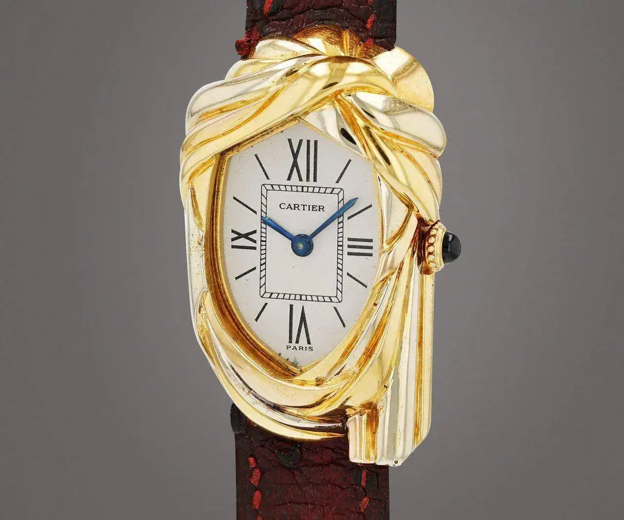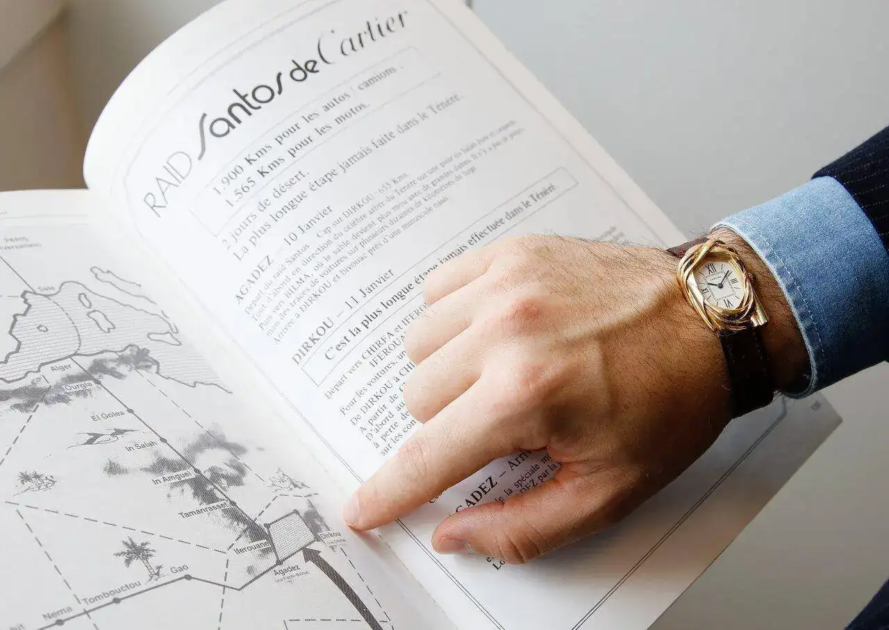 Siendo que en aquella época prácticamente el 100% de participantes en la carrera eran masculinos (repito, era otra época), Sabine y Perrin llegaron a la conclusión de que el regalo ideal del Cartier Challenge era un reloj. Pero ambos estaban de acuerdo en que no podía ser una simple variación de un modelo ya existente de la marca, y mucho menos un simple grabado en la tapa trasera. Lo suyo era crear un reloj totalmente nuevo, diferente y que tuviera una relación total con la prueba. La tarea del su diseño recayó en Jacques Diltoer, director creativo de la maison, que decidió probar con una idea que se encontraba entre lo obvio y lo extravagante: tomar como base el logo del París-Dakar de esos años. Éste consistía en una imagen del cheich, nombre que recibe el turbante con el que los touaregs protegen su cabeza del implacable sol del desierto.