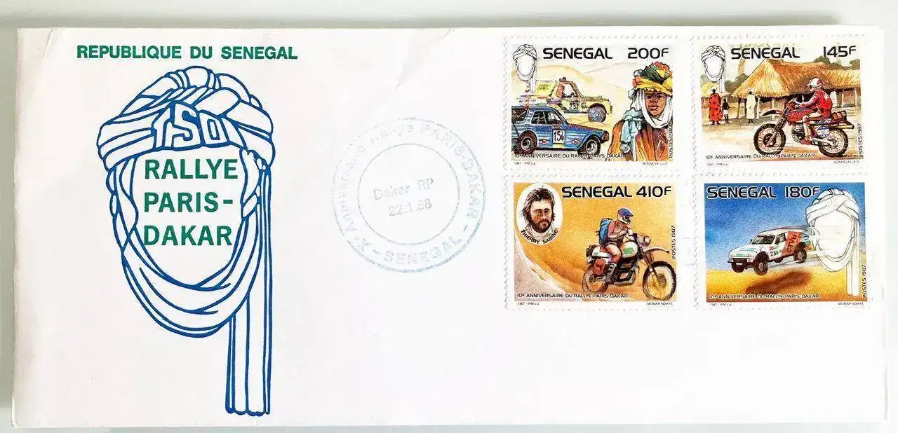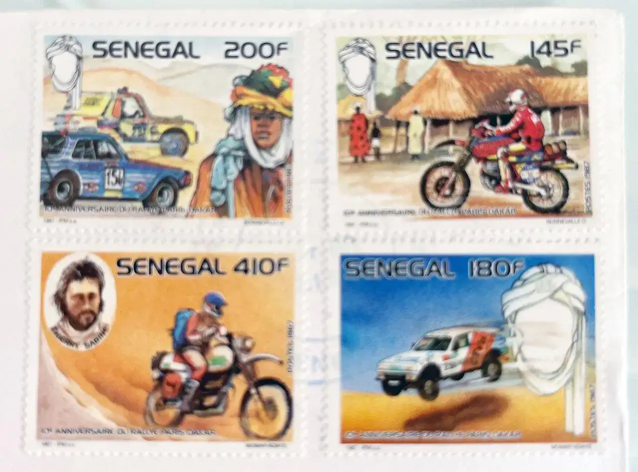 Me permitirás que complemente tu precioso relato con una pieza que guardo en mi colección de "motorabilia" (soy coleccionista de piezas relacionadas con la competición). Son unos sellos de Senegal, dedicados a la memoria del creador del Dakar: