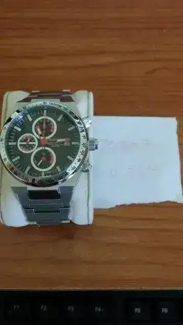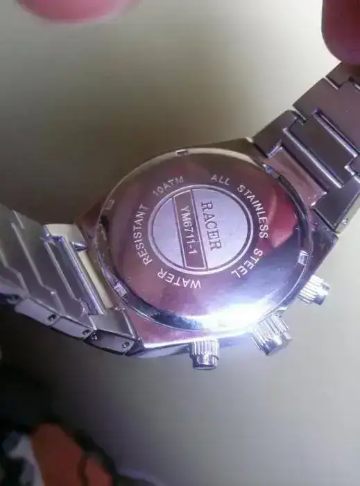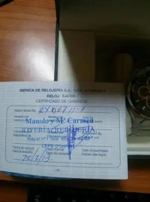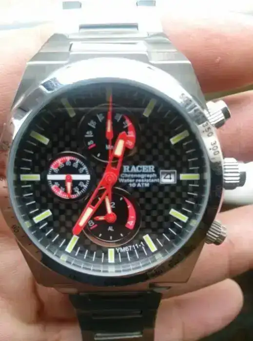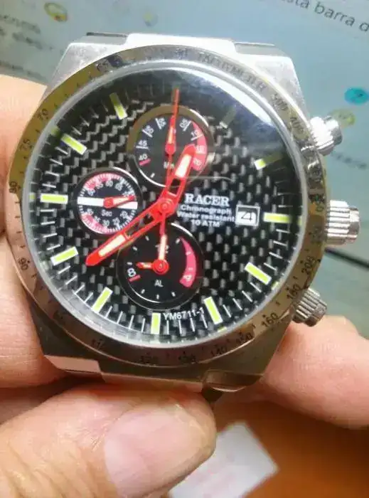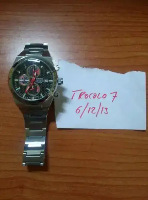 Hola, compañeros. Vendo este Racer crono de reestreno, un par de puestas nada más. Comprado en relojería el 20-7-13, así pues, año y medio de garantía por delante. El reloj como digo está perfecto, salvo los dichosos pelillos del cierre y armis que son inevitables. Por lo demás, cristal y caja perfecta. Maquinaria de cuarzo (Seiko). Tiene funciones de crono, calendario a las 3 y la trotadora corre como en un automático. La esfera esfera imita a la fibra de carbono y queda chulísima, aparte de la caja, con aire Daytona. Francamente chulo en peluco. Lo que parecen rayones en el bisel, son mis huellas, está perfecto. El precio que pongo es 100 euros, dado su buenísimo estado. Incluye caja original, eslabones sobrantes y garantía todavía en vigor. Envío incluido. No quiero cambios. Gracias a todos y a R.E.
